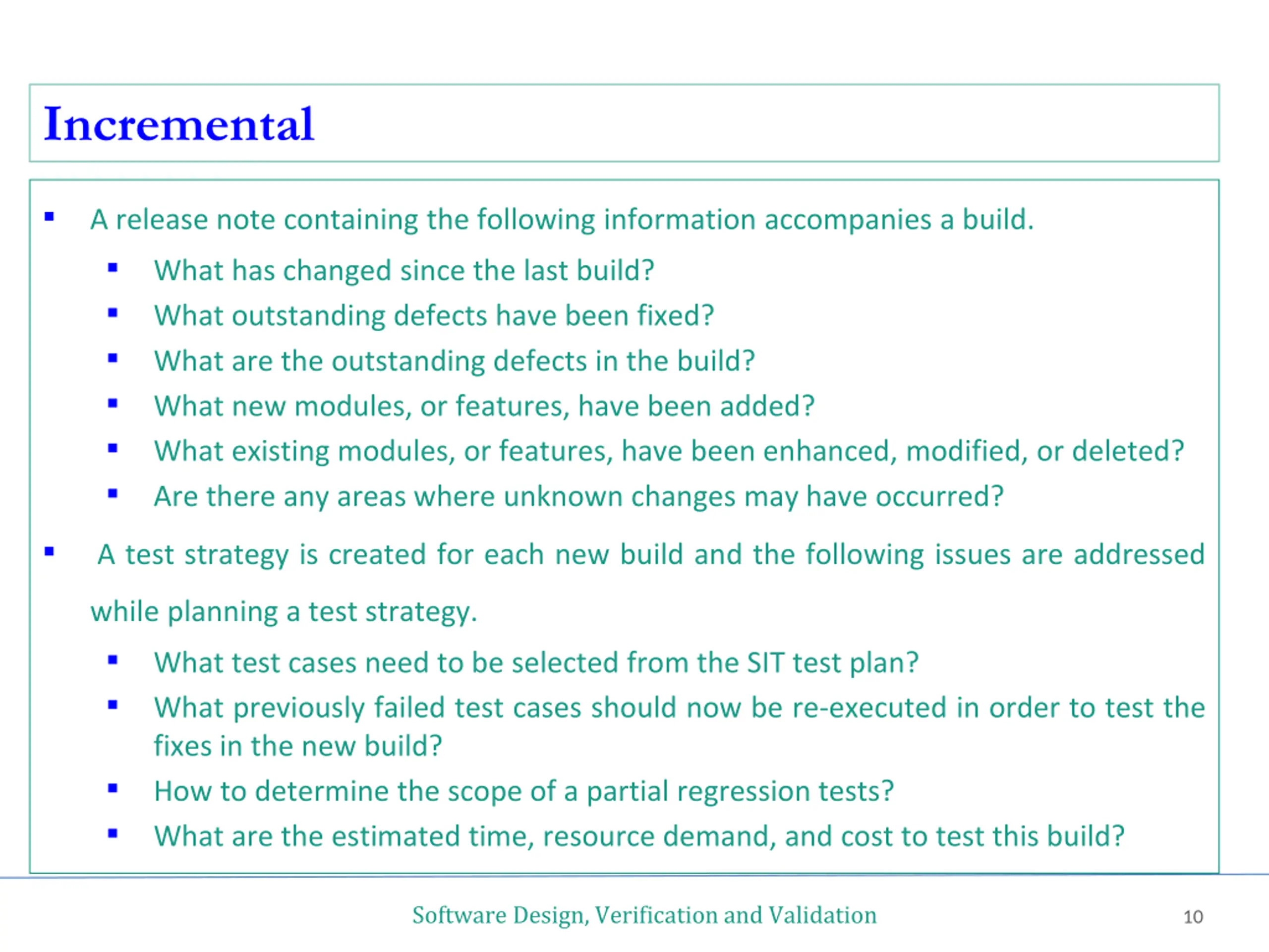 Incremental A release note containing the following information accompanies a build. What has changed since the last build? What outstanding defects have been fixed? What are the outstanding defects in the build? What new modules, or features, have been added? What existing modules, or features, have been enhanced, modified, or deleted? Are there any areas where unknown changes may have occurred? A test strategy is created for each new build and the following issues are addressed while planning a test strategy. What test cases need to be selected from the SIT test plan? What previously failed test cases should now be re-executed in order to test the fixes in the new build? How to determine the scope of a partial regression tests? What are the estimated time, resource demand, and cost to test this build? Software Design, Verification and Validation 10