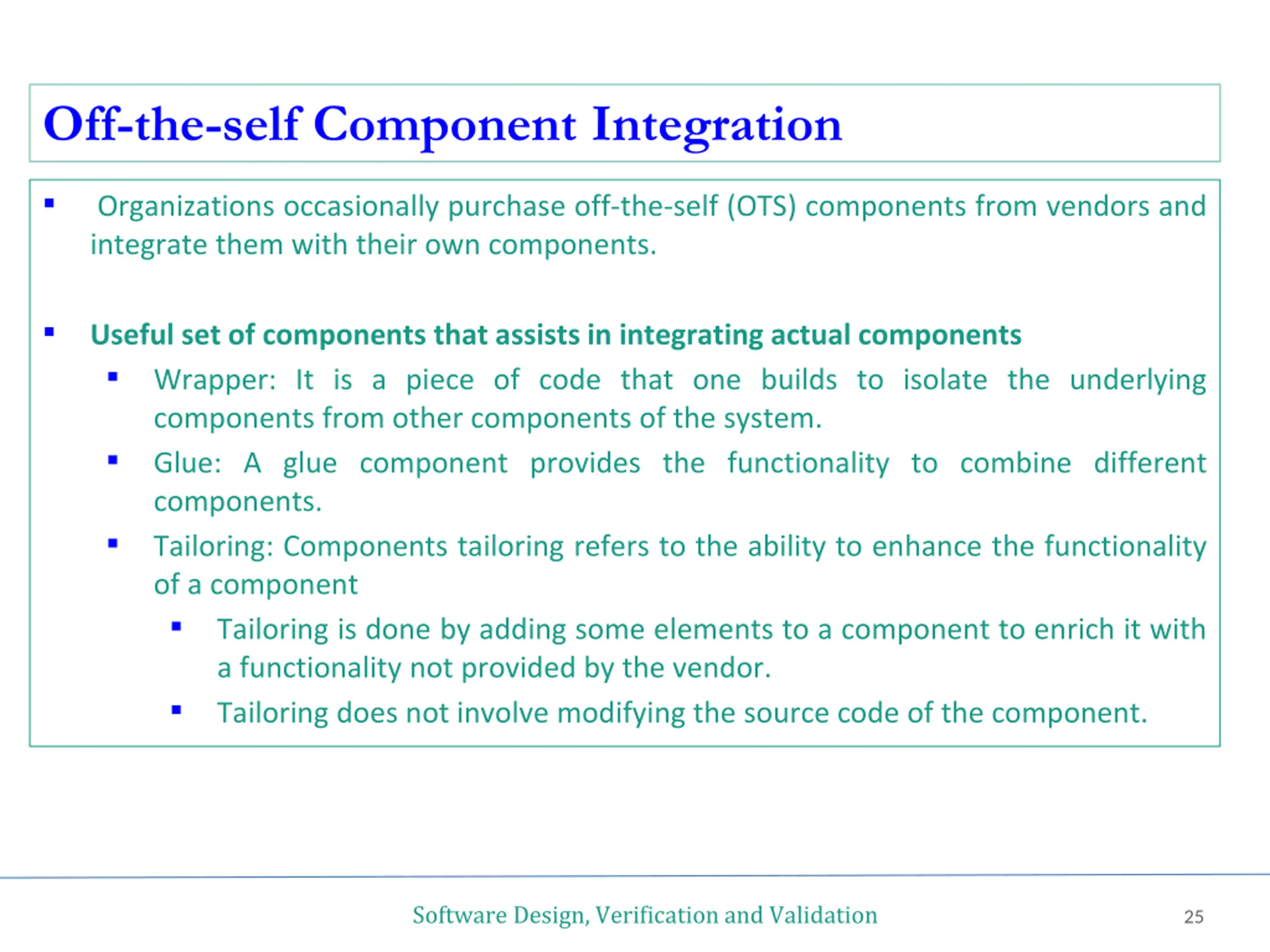 Off-the-self Component Integration Organizations occasionally purchase off-the-self (OTS) components from vendors and integrate them with their own components. Useful set of components that assists in integrating actual components Wrapper: It is a piece of code that one builds to isolate the underlying components from other components of the system. Glue: A glue component provides the functionality to combine different components. Tailoring: Components tailoring refers to the ability to enhance the functionality of a component Tailoring is done by adding some elements to a component to enrich it with a functionality not provided by the vendor. Tailoring does not involve modifying the source code of the component. Software Design, Verification and Validation 25