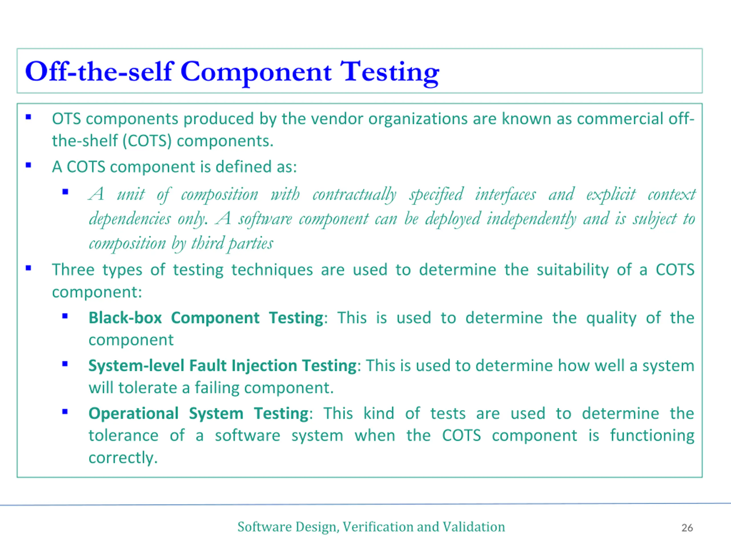 Off-the-self Component Testing OTS components produced by the vendor organizations are known as commercial off- the-shelf (COTS) components. A COTS component is defined as: A unit of composition with contractually specified interfaces and explicit context dependencies only. A software component can be deployed independently and is subject to composition by third parties Three types of testing techniques are used to determine the suitability of a COTS component: Black-box Component Testing: This is used to determine the quality of the component System-level Fault Injection Testing: This is used to determine how well a system will tolerate a failing component. Operational System Testing: This kind of tests are used to determine the tolerance of a software system when the COTS component is functioning correctly. Software Design, Verification and Validation 26