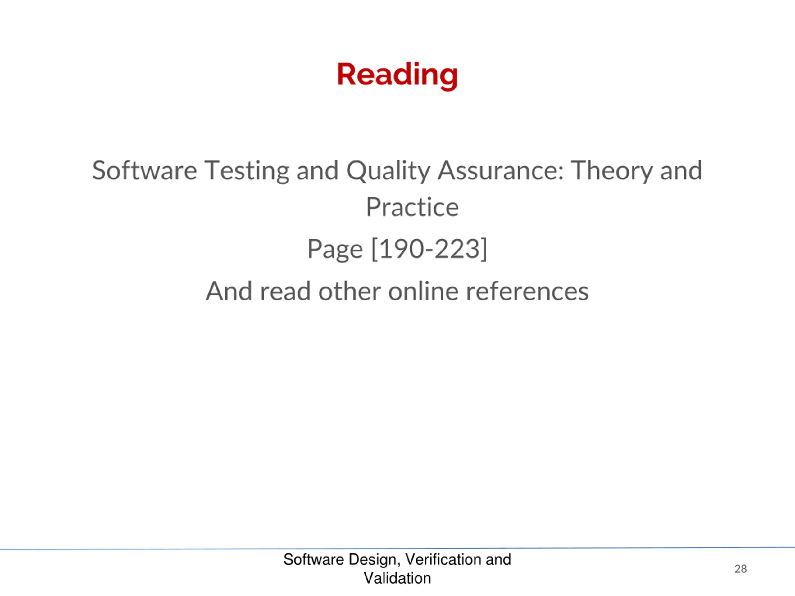 Reading Software Testing and Quality Assurance: Theory and Practice Page [190-223] And read other online references Software Design, Verification and Validation 28