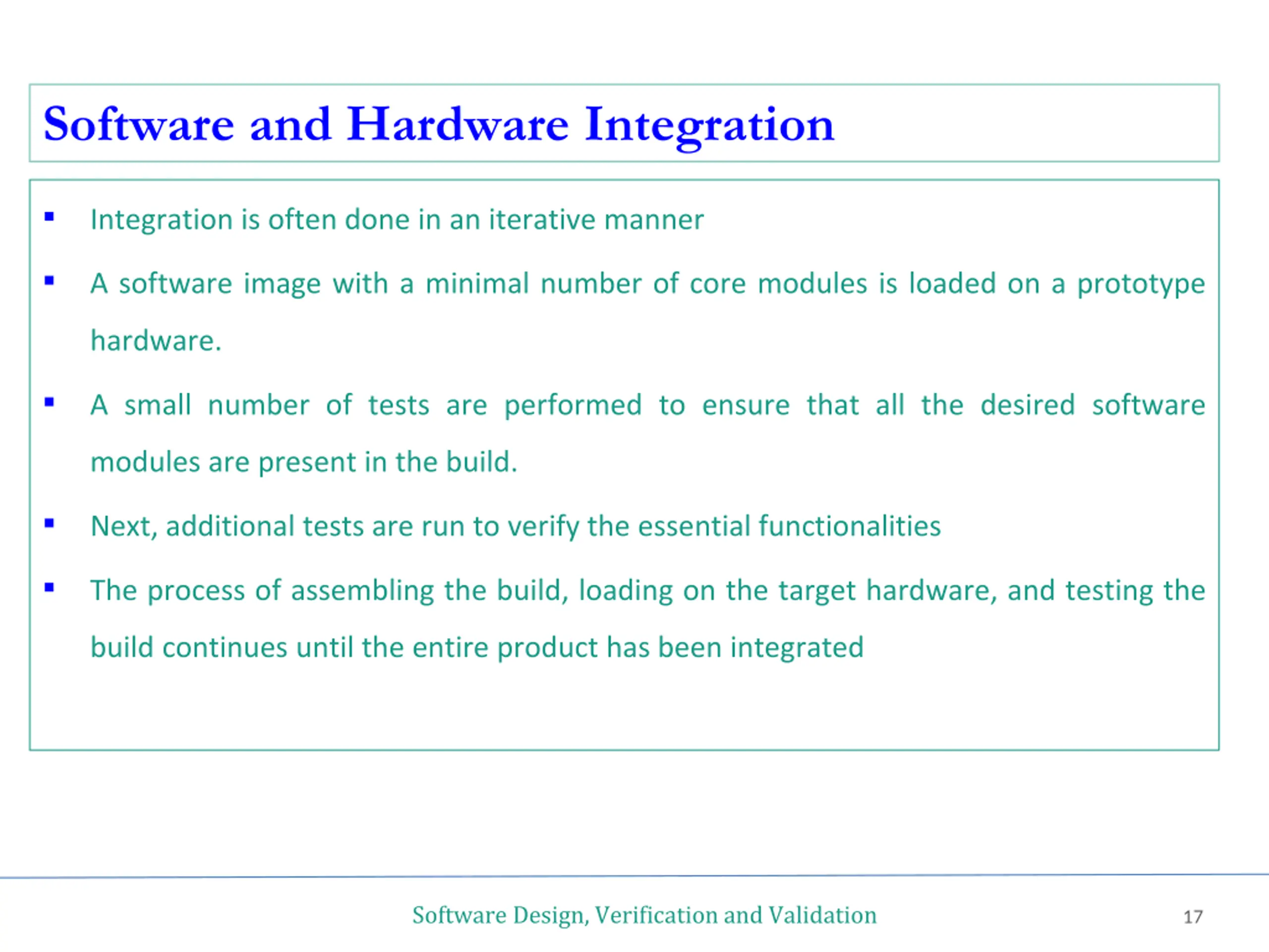Software and Hardware Integration Integration is often done in an iterative manner A software image with a minimal number of core modules is loaded on a prototype hardware. A small number of tests are performed to ensure that all the desired software modules are present in the build. Next, additional tests are run to verify the essential functionalities The process of assembling the build, loading on the target hardware, and testing the build continues until the entire product has been integrated Software Design, Verification and Validation 17