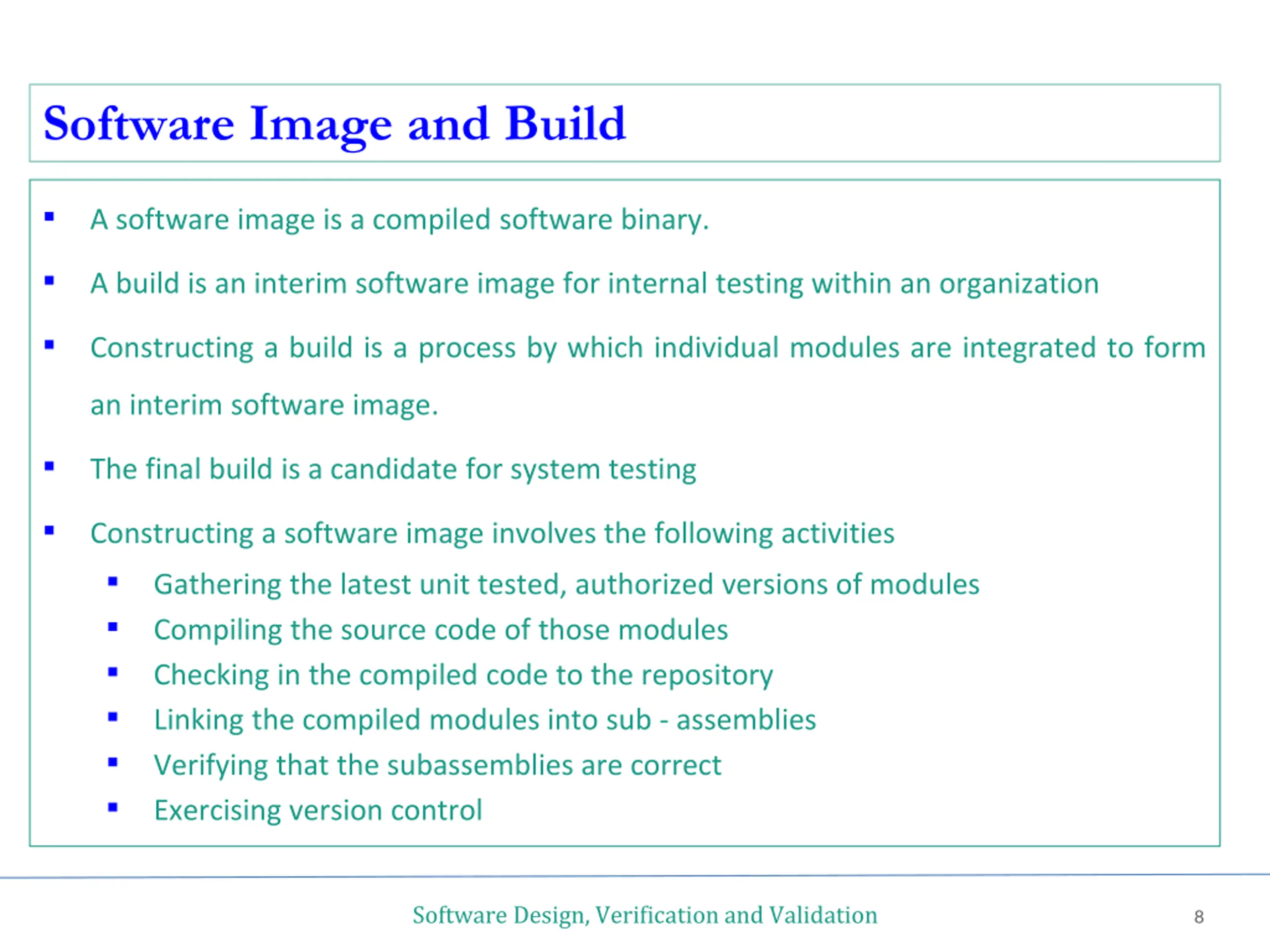 Software Image and Build A software image is a compiled software binary. A build is an interim software image for internal testing within an organization Constructing a build is a process by which individual modules are integrated to form an interim software image. The final build is a candidate for system testing Constructing a software image involves the following activities Gathering the latest unit tested, authorized versions of modules Compiling the source code of those modules Checking in the compiled code to the repository Linking the compiled modules into sub - assemblies Verifying that the subassemblies are correct Exercising version control Software Design, Verification and Validation 8