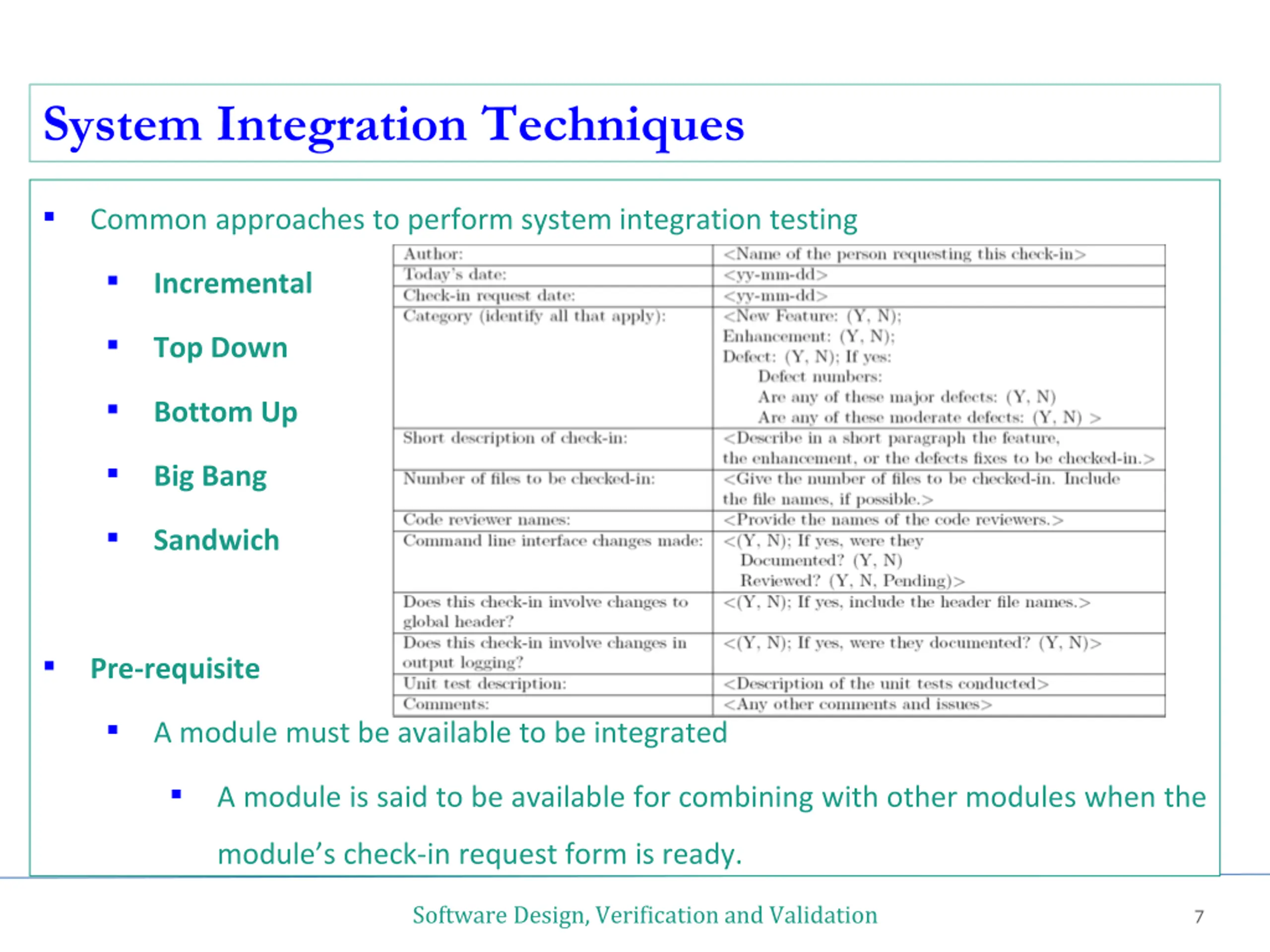 System Integration Techniques Common approaches to perform system integration testing Incremental Top Down Bottom Up Big Bang Sandwich Pre-requisite A module must be available to be integrated A module is said to be available for combining with other modules when the module s check-in request form is ready. Software Design, Verification and Validation 7