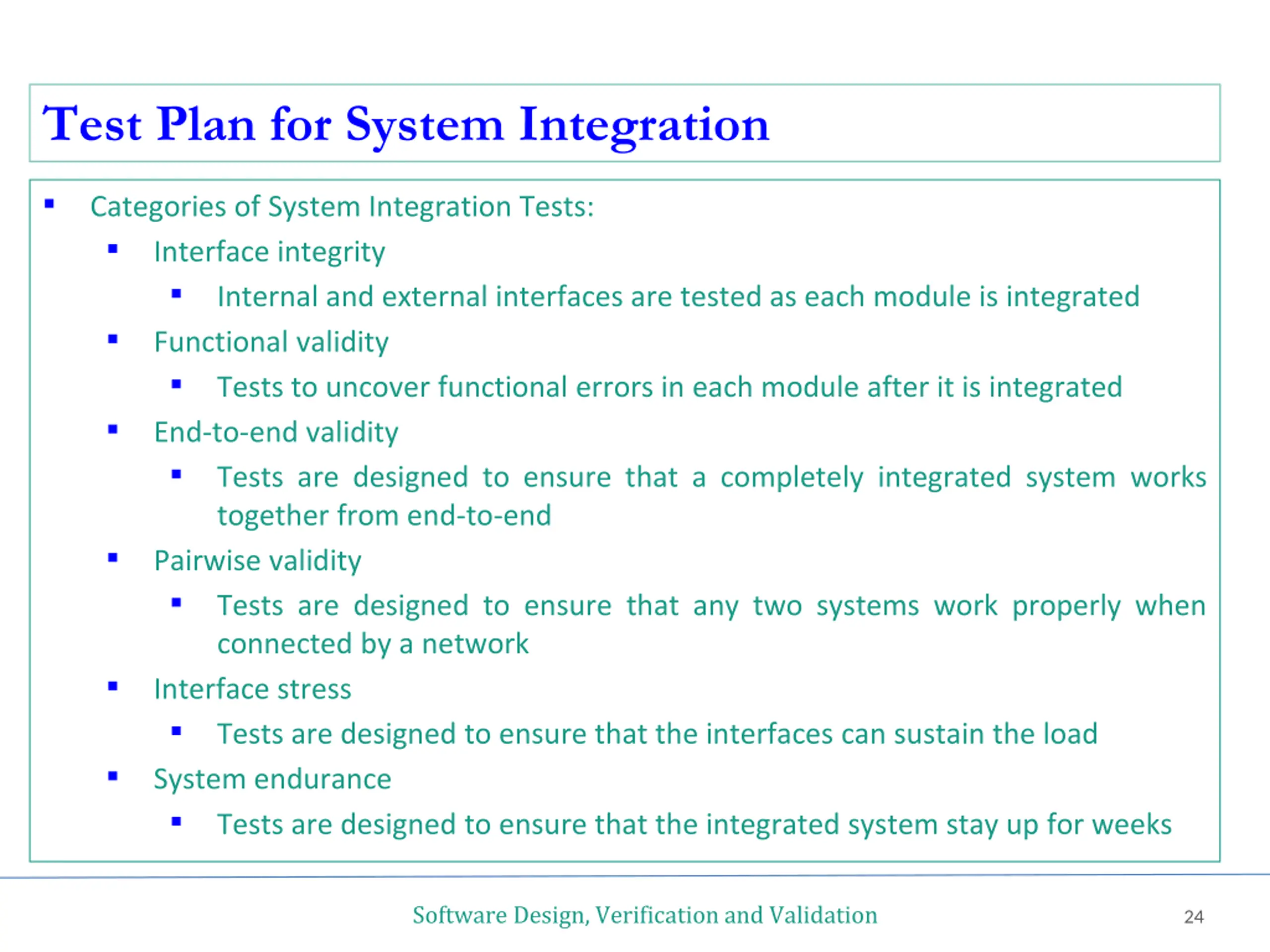 Test Plan for System Integration Categories of System Integration Tests: Interface integrity Internal and external interfaces are tested as each module is integrated Functional validity Tests to uncover functional errors in each module after it is integrated End-to-end validity Tests are designed to ensure that a completely integrated system works together from end-to-end Pairwise validity Tests are designed to ensure that any two systems work properly when connected by a network Interface stress Tests are designed to ensure that the interfaces can sustain the load System endurance Tests are designed to ensure that the integrated system stay up for weeks Software Design, Verification and Validation 24