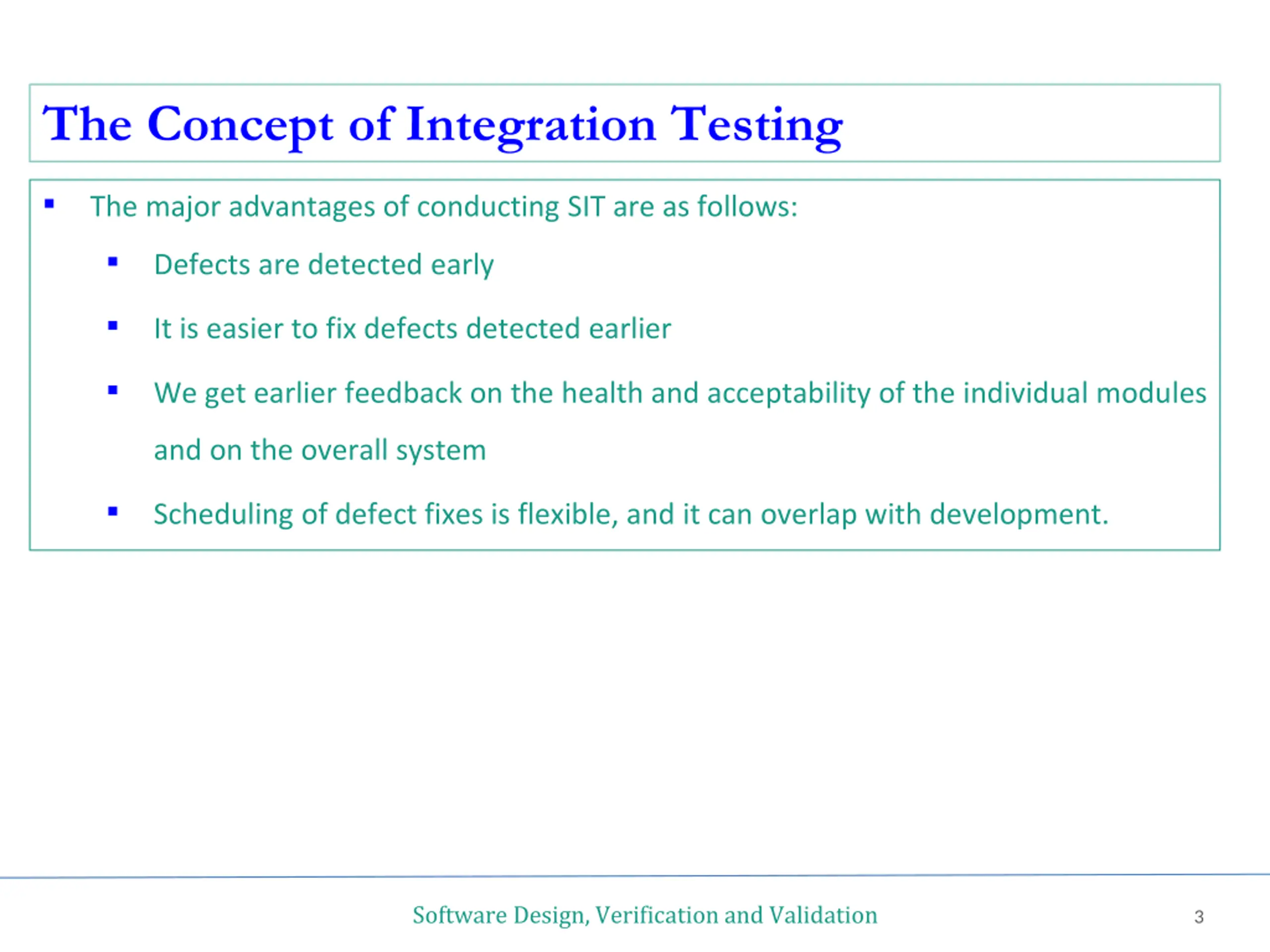 The Concept of Integration Testing The major advantages of conducting SIT are as follows: Defects are detected early It is easier to fix defects detected earlier We get earlier feedback on the health and acceptability of the individual modules and on the overall system Scheduling of defect fixes is flexible, and it can overlap with development. Software Design, Verification and Validation 3