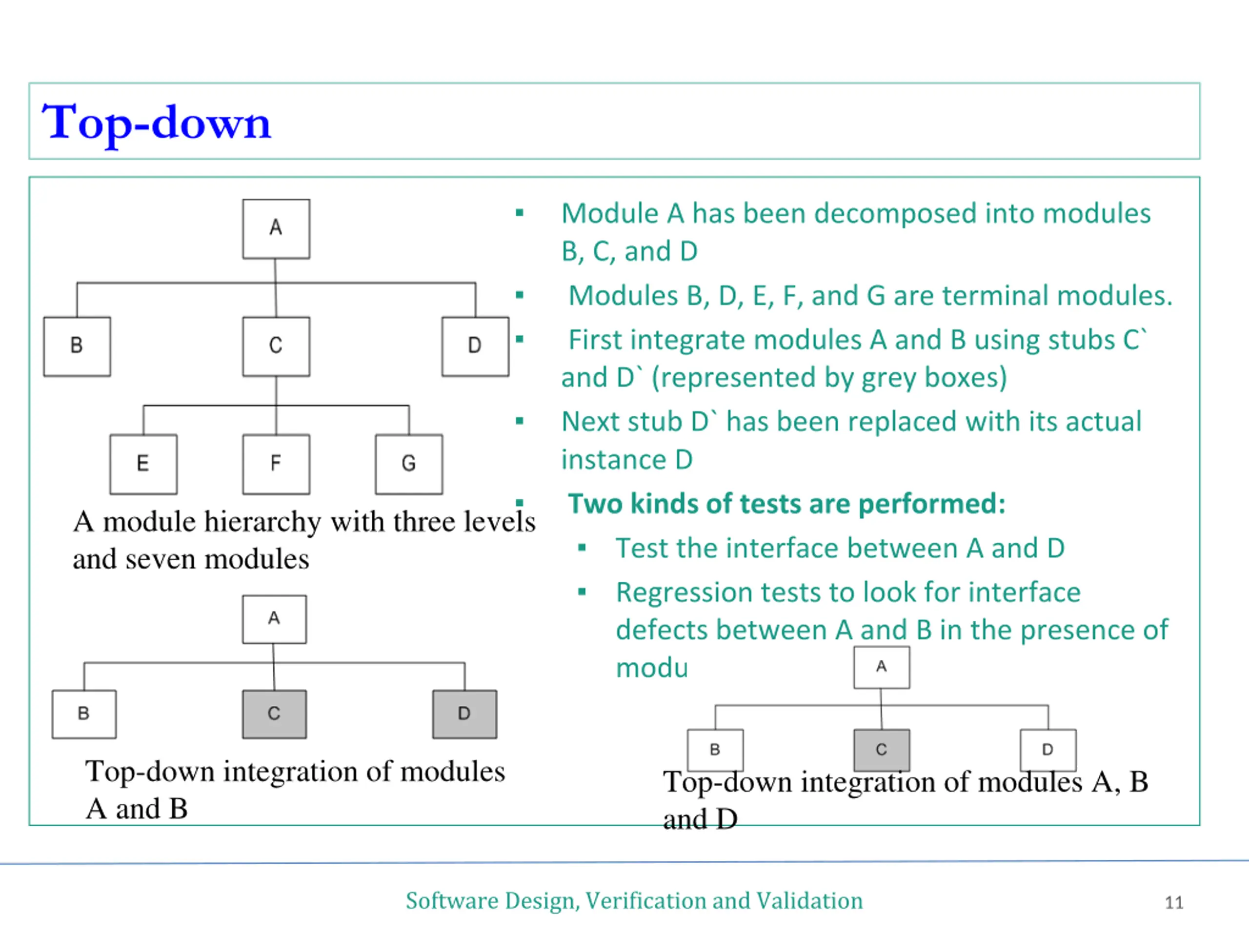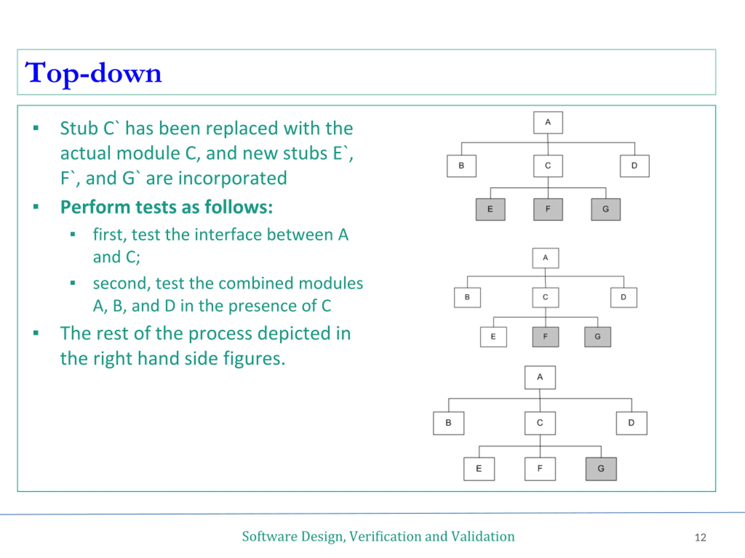 Top-down Stub C` has been replaced with the actual module C, and new stubs E`, F`, and G` are incorporated Perform tests as follows: first, test the interface between A and C; second, test the combined modules A, B, and D in the presence of C The rest of the process depicted in the right hand side figures. Software Design, Verification and Validation 12