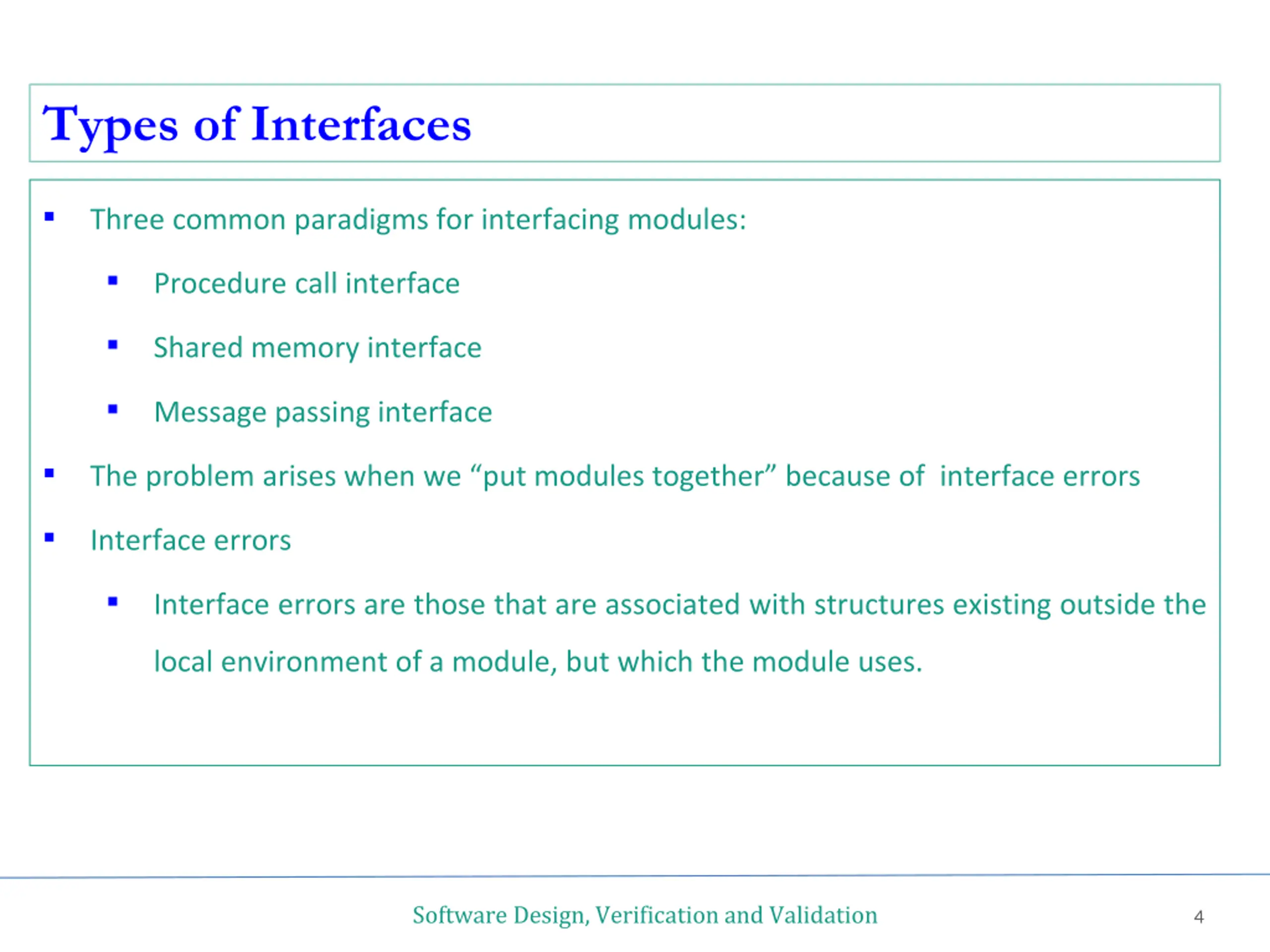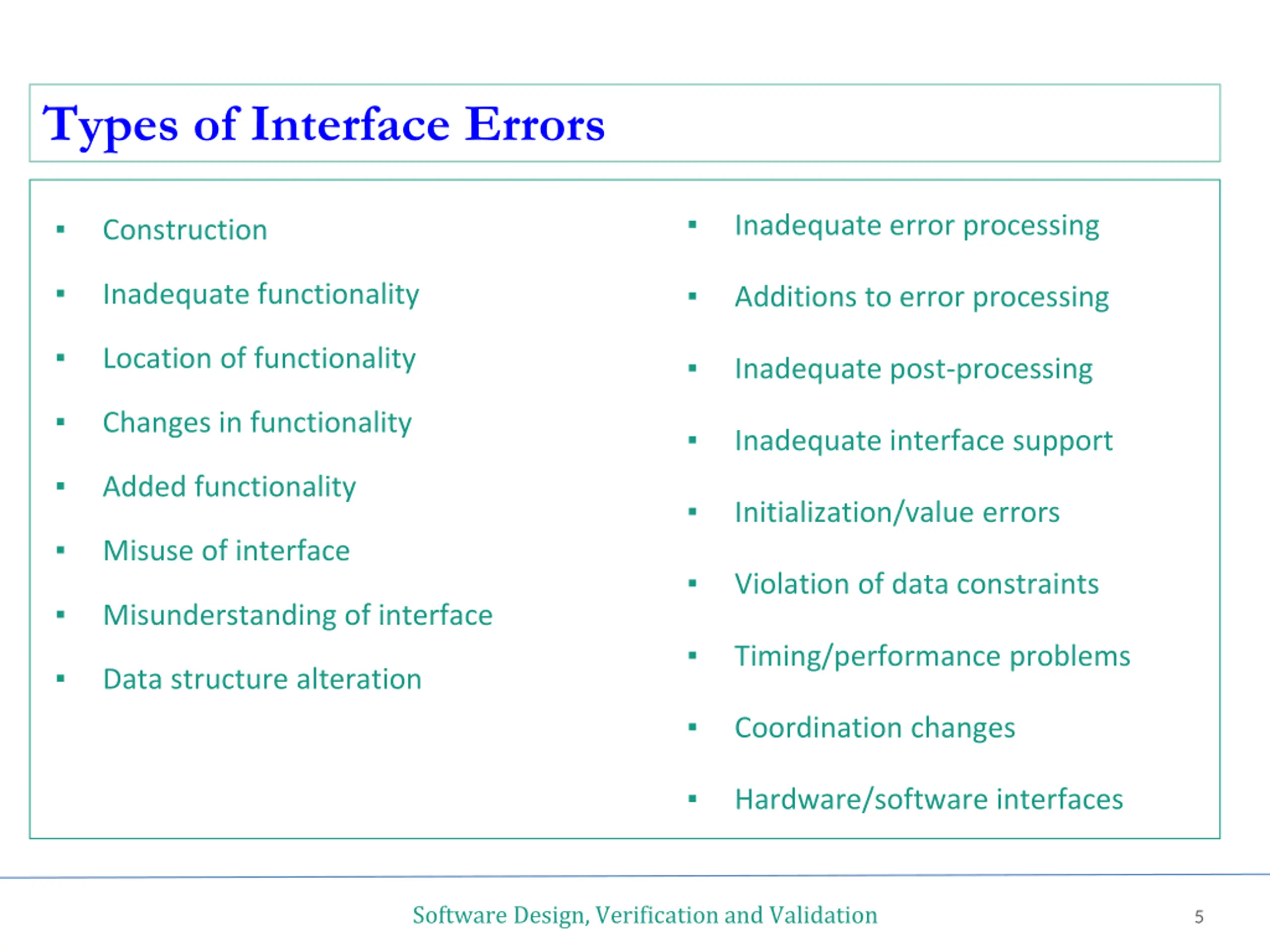 Types of Interfaces Three common paradigms for interfacing modules: Procedure call interface Shared memory interface Message passing interface The problem arises when we put modules together because of interface errors Interface errors Interface errors are those that are associated with structures existing outside the local environment of a module, but which the module uses. Software Design, Verification and Validation 4