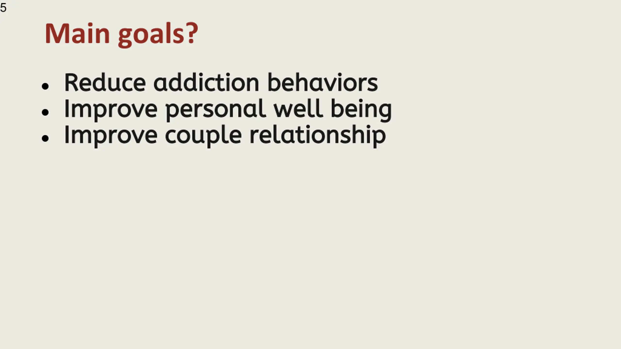 5 Main goals? Reduce Reduce addiction Improve Improve personal Improve Improve couple addiction behaviors personal well couple relationship relationship behaviors well being being