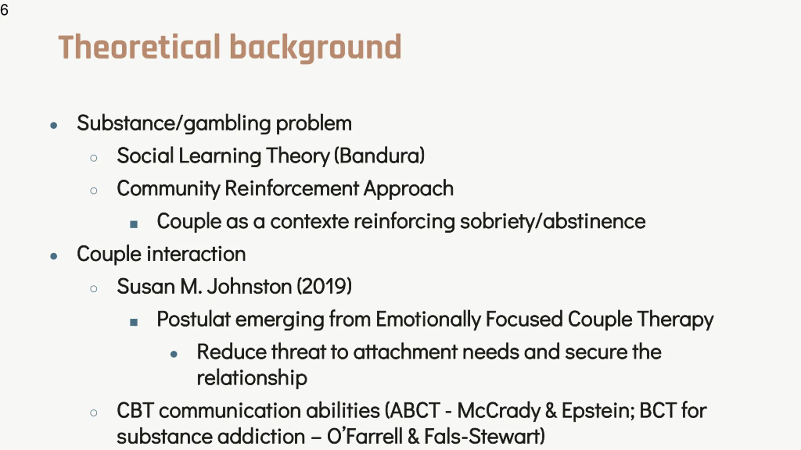 6 Theoretical background Substance/gambling Substance/gambling problem Social Learning Theory (Bandura) Social Learning Theory (Bandura) Community Community Reinforcement Reinforcement Approach Couple as a contexte Couple as a contexte reinforcing Couple interaction Couple interaction Susan M. Johnston (2019) Susan M. Johnston (2019) Postulat Postulat emerging emerging from Reduce Reduce threat relationship relationship CBT communication CBT communication abilities substance addiction substance addiction O Farrell problem Approach reinforcing sobriety sobriety/abstinence /abstinence from Emotionally Emotionally Focused threat to to attachment attachment needs Focused Couple needs and and secure Couple Therapy Therapy secure the the abilities (ABCT O Farrell & & Fals (ABCT - - McCrady McCrady & Epstein; BCT for & Epstein; BCT for Fals- -Stewart) Stewart)