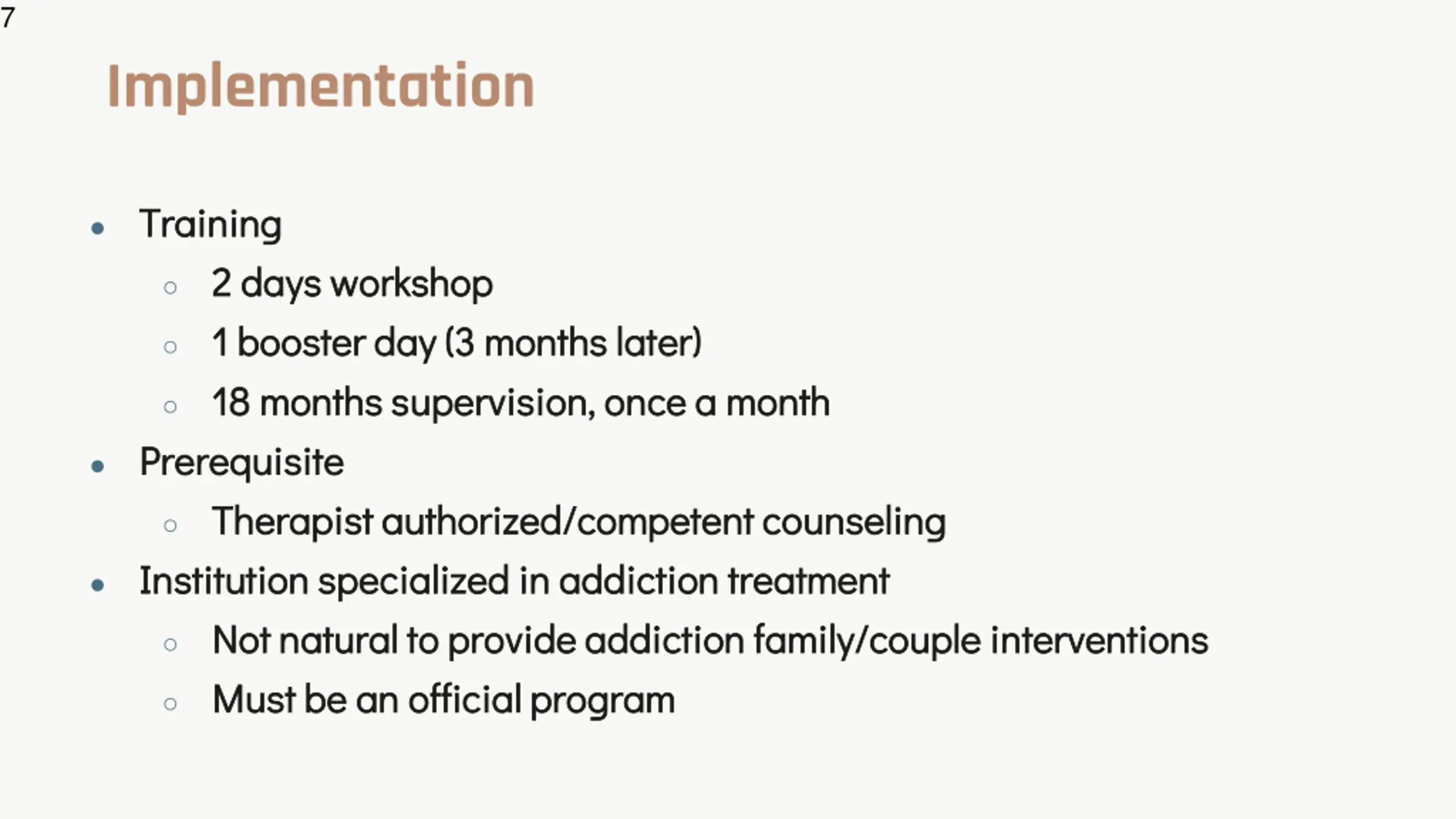 7 Implementation Training Training 2 2 days 1 booster 1 booster day 18 18 months months supervision, once a supervision, once a month Prerequisite Prerequisite Therapist Therapist authorized authorized/ /competent Institution Institution specialized specialized in addiction Not Not natural natural to to provide provide addiction Must Must be be an official program an official program days workshop workshop day (3 (3 months months later later) ) month competent counseling in addiction treatment treatment addiction family counseling family/couple interventions /couple interventions