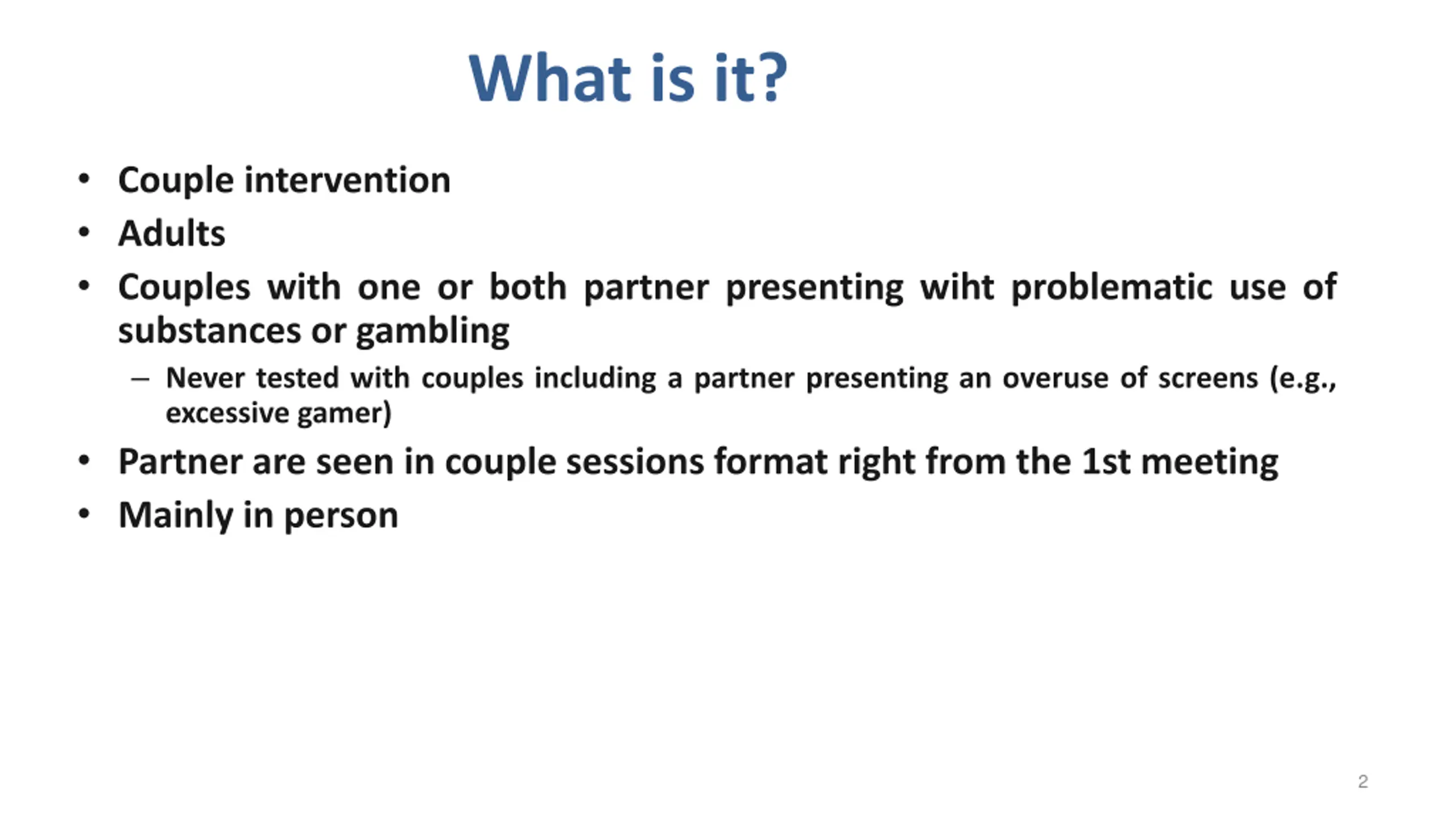 What is it? Couple intervention Adults Couples with one or both partner presenting wiht problematic use of substances or gambling Never tested with couples including a partner presenting an overuse of screens (e.g., excessive gamer) Partner are seen in couple sessions format right from the 1st meeting Mainly in person 2