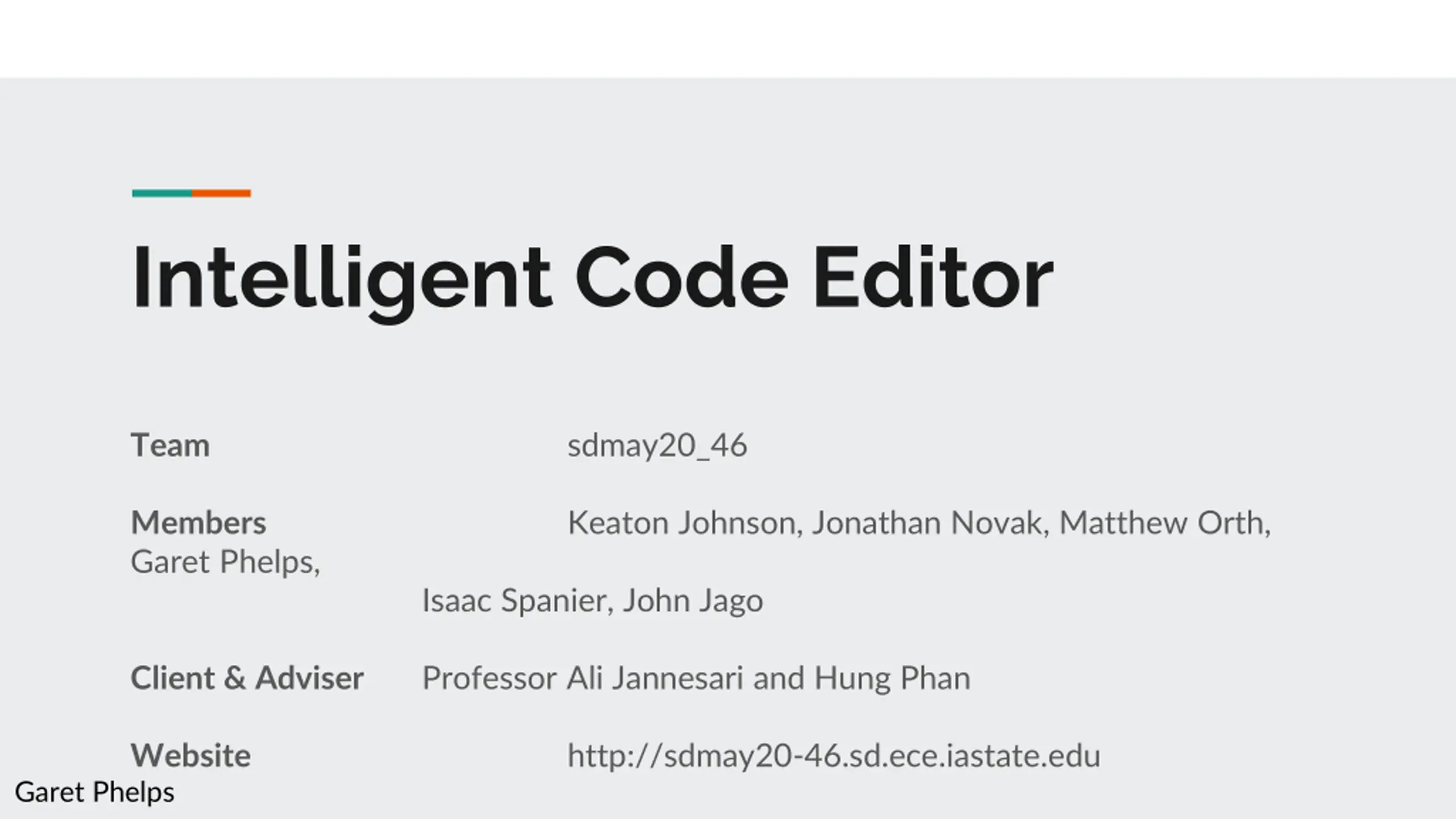 Intelligent Code Editor Team sdmay20_46 Members Garet Phelps, Keaton Johnson, Jonathan Novak, Matthew Orth, Isaac Spanier, John Jago Client & Adviser Professor Ali Jannesari and Hung Phan Website http://sdmay20-46.sd.ece.iastate.edu Garet Phelps