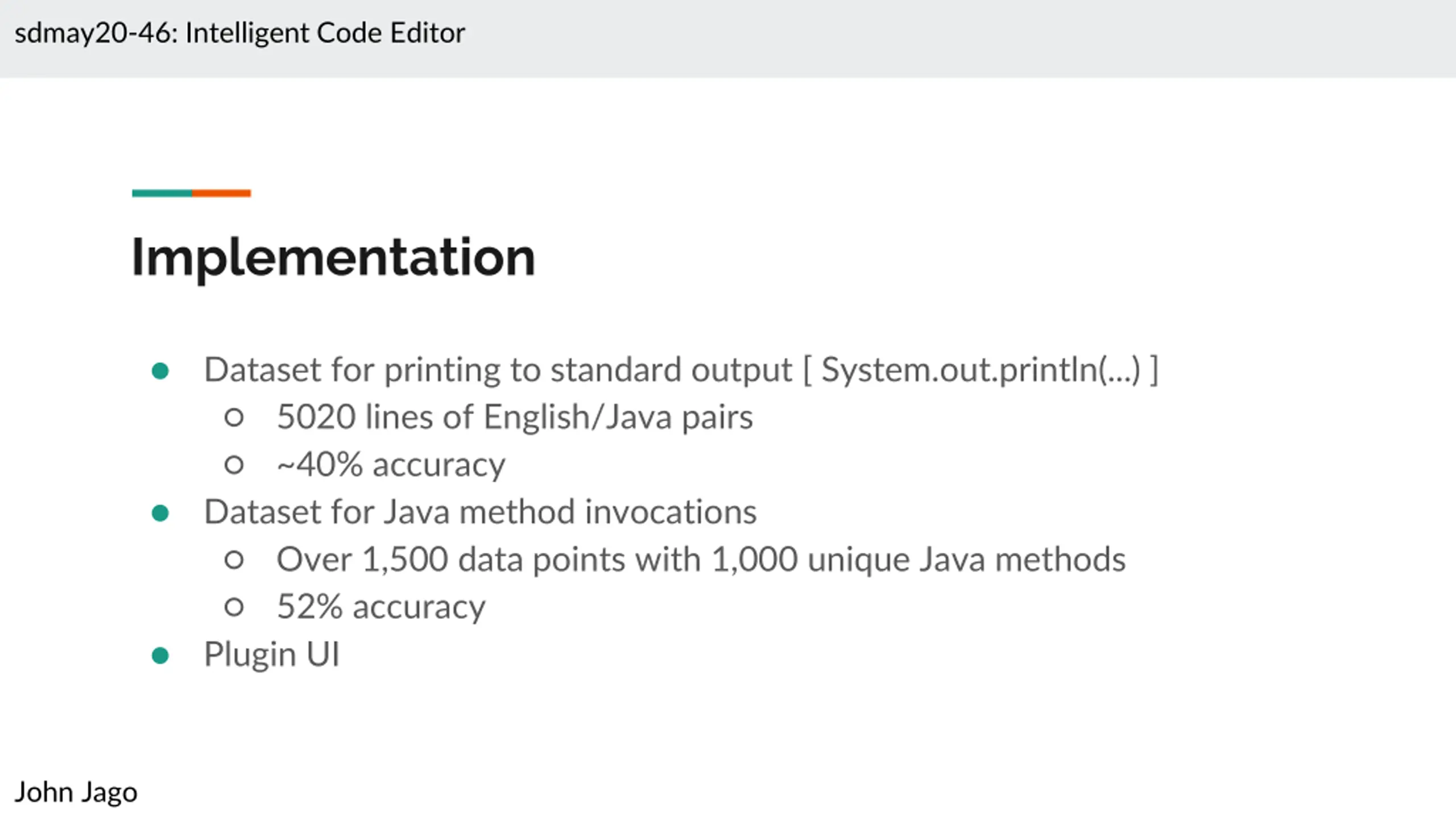 sdmay20-46: Intelligent Code Editor Implementation Dataset for printing to standard output [ System.out.println(...) ] 5020 lines of English/Java pairs ~40% accuracy Dataset for Java method invocations Over 1,500 data points with 1,000 unique Java methods 52% accuracy Plugin UI John Jago