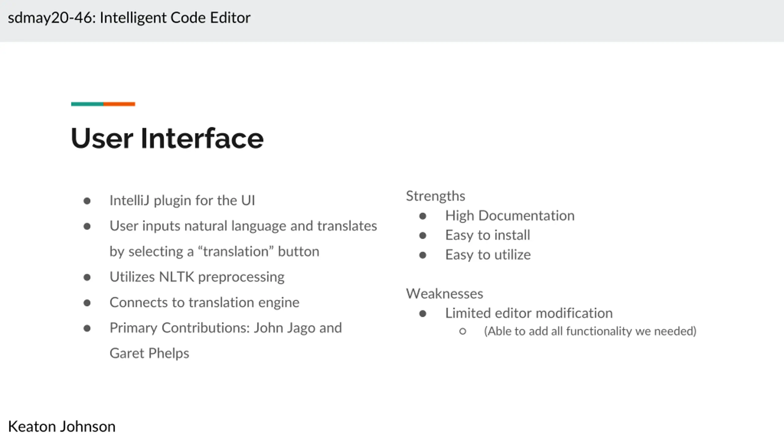 sdmay20-46: Intelligent Code Editor User Interface Strengths IntelliJ plugin for the UI High Documentation Easy to install Easy to utilize User inputs natural language and translates by selecting a translation button Utilizes NLTK preprocessing Weaknesses Connects to translation engine Limited editor modification (Able to add all functionality we needed) Primary Contributions: John Jago and Garet Phelps Keaton Johnson