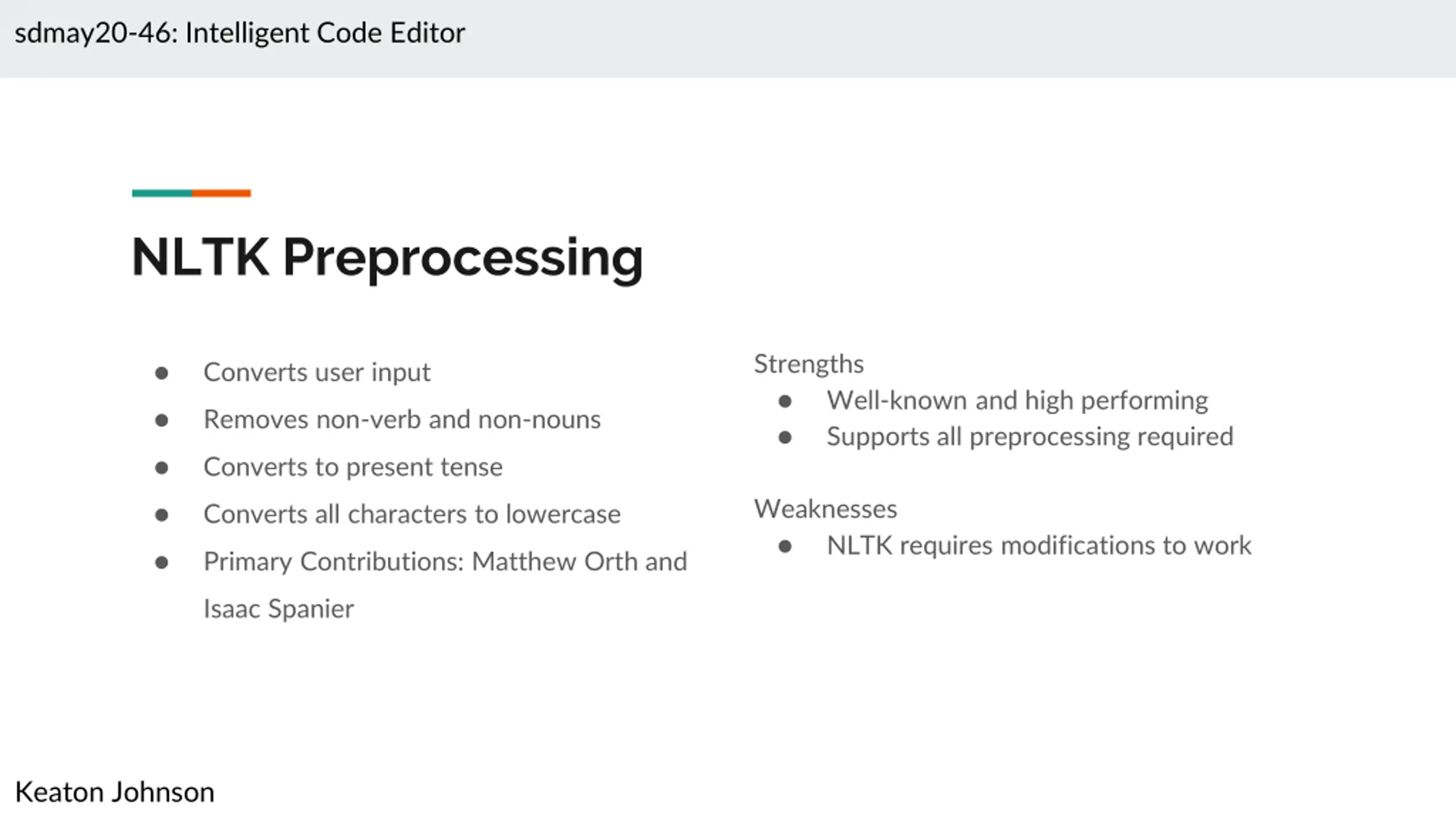sdmay20-46: Intelligent Code Editor NLTK Preprocessing Strengths Converts user input Well-known and high performing Supports all preprocessing required Removes non-verb and non-nouns Converts to present tense Weaknesses Converts all characters to lowercase NLTK requires modifications to work Primary Contributions: Matthew Orth and Isaac Spanier Keaton Johnson