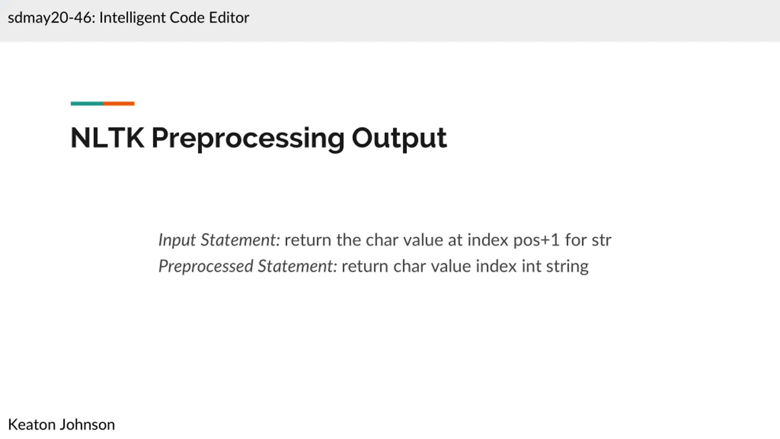 sdmay20-46: Intelligent Code Editor NLTK Preprocessing Output Input Statement: return the char value at index pos+1 for str Preprocessed Statement: return char value index int string Keaton Johnson
