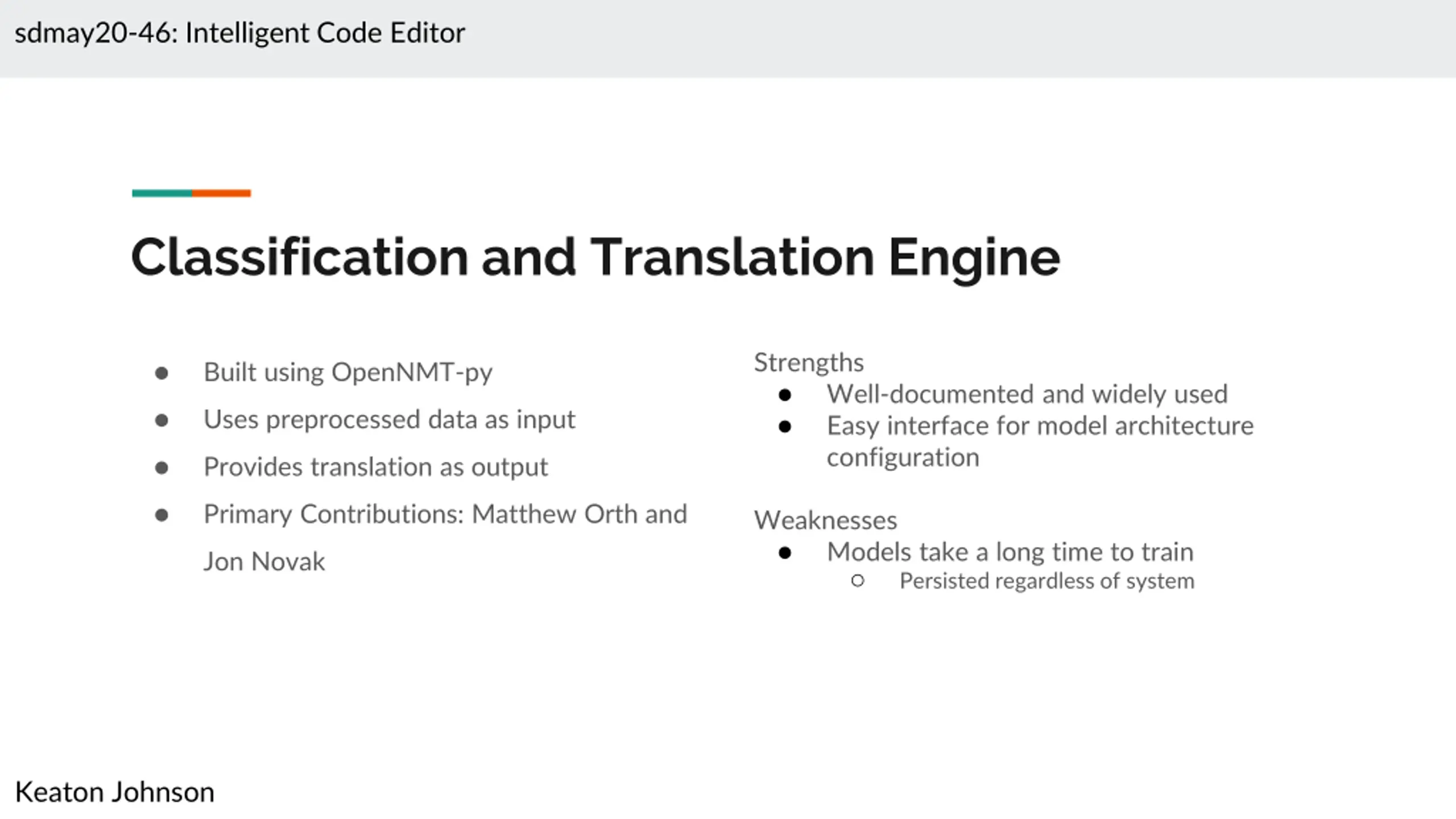sdmay20-46: Intelligent Code Editor Classification and Translation Engine Strengths Built using OpenNMT-py Well-documented and widely used Easy interface for model architecture configuration Uses preprocessed data as input Provides translation as output Primary Contributions: Matthew Orth and Weaknesses Models take a long time to train Persisted regardless of system Jon Novak Keaton Johnson