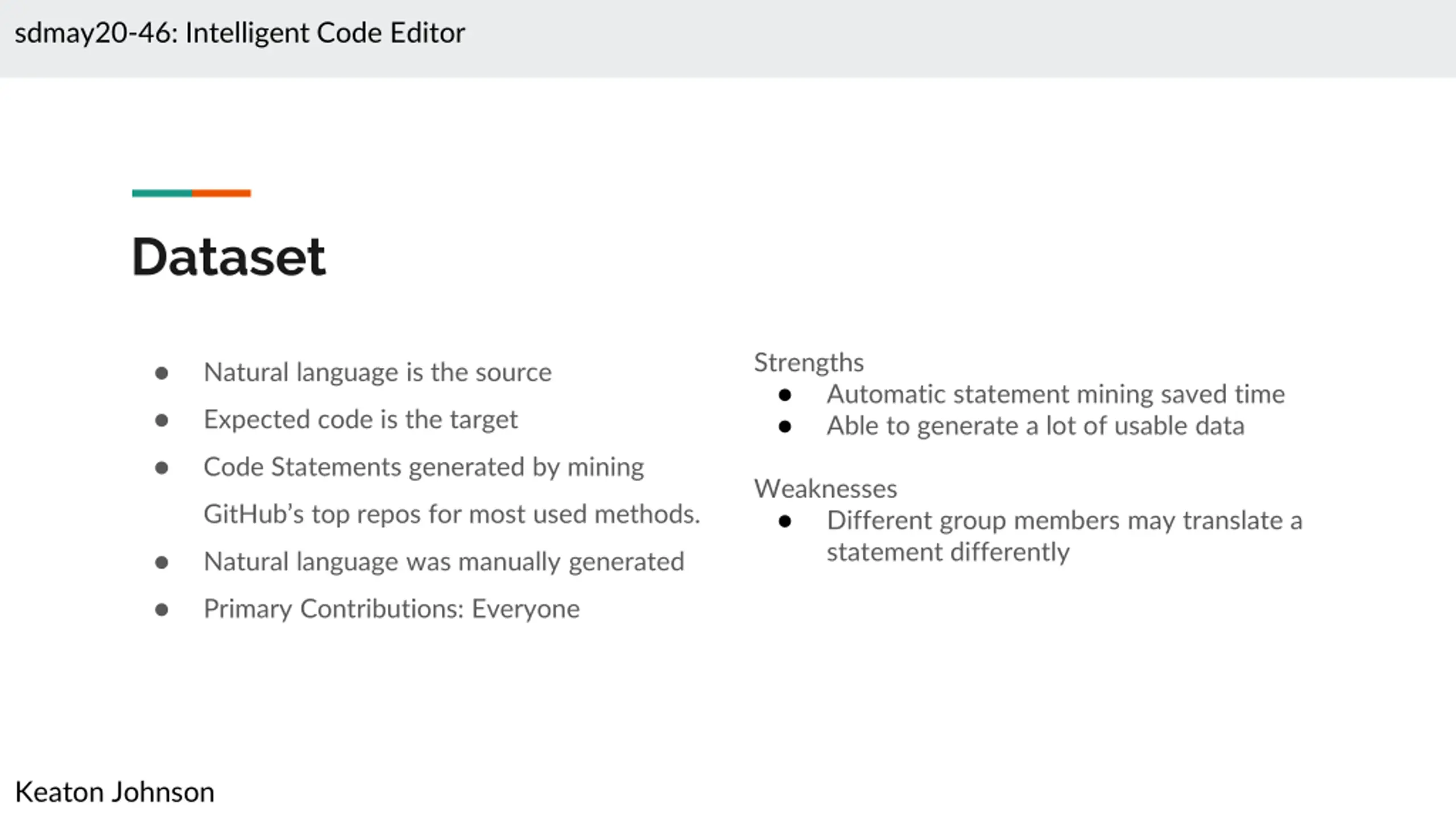 sdmay20-46: Intelligent Code Editor Dataset Strengths Natural language is the source Automatic statement mining saved time Able to generate a lot of usable data Expected code is the target Code Statements generated by mining Weaknesses GitHub s top repos for most used methods. Different group members may translate a statement differently Natural language was manually generated Primary Contributions: Everyone Keaton Johnson