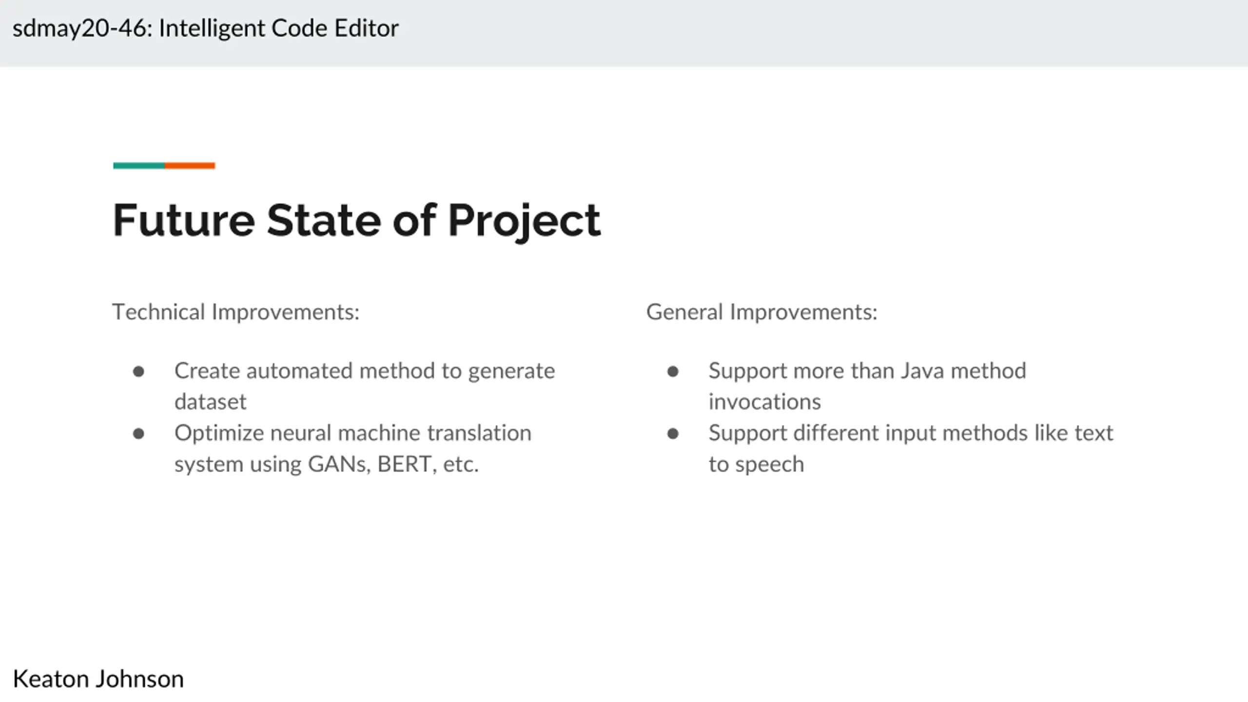 sdmay20-46: Intelligent Code Editor Future State of Project Technical Improvements: General Improvements: Create automated method to generate dataset Optimize neural machine translation system using GANs, BERT, etc. Support more than Java method invocations Support different input methods like text to speech Keaton Johnson
