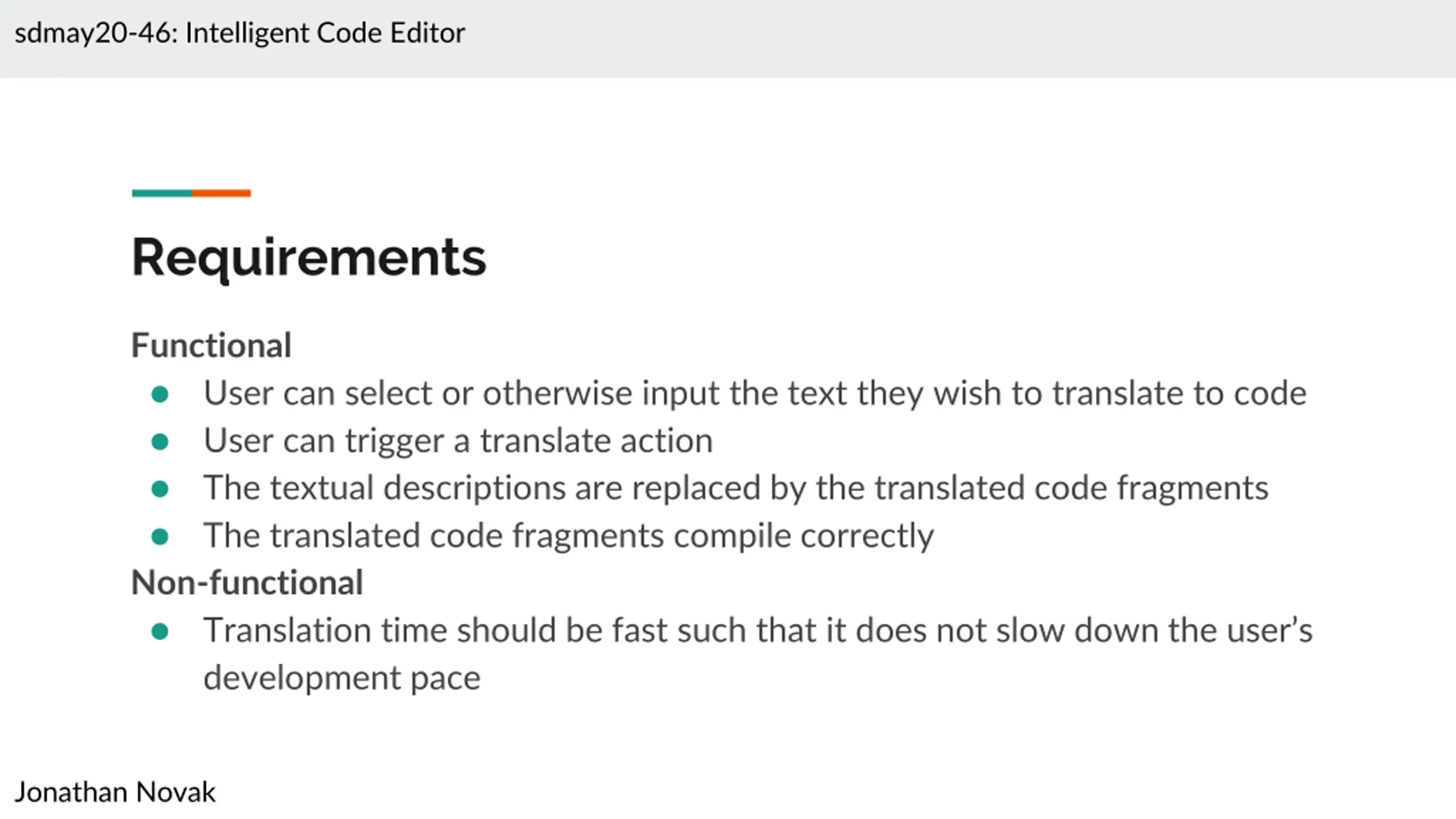 sdmay20-46: Intelligent Code Editor Requirements Functional User can select or otherwise input the text they wish to translate to code User can trigger a translate action The textual descriptions are replaced by the translated code fragments The translated code fragments compile correctly Non-functional Translation time should be fast such that it does not slow down the user s development pace Jonathan Novak