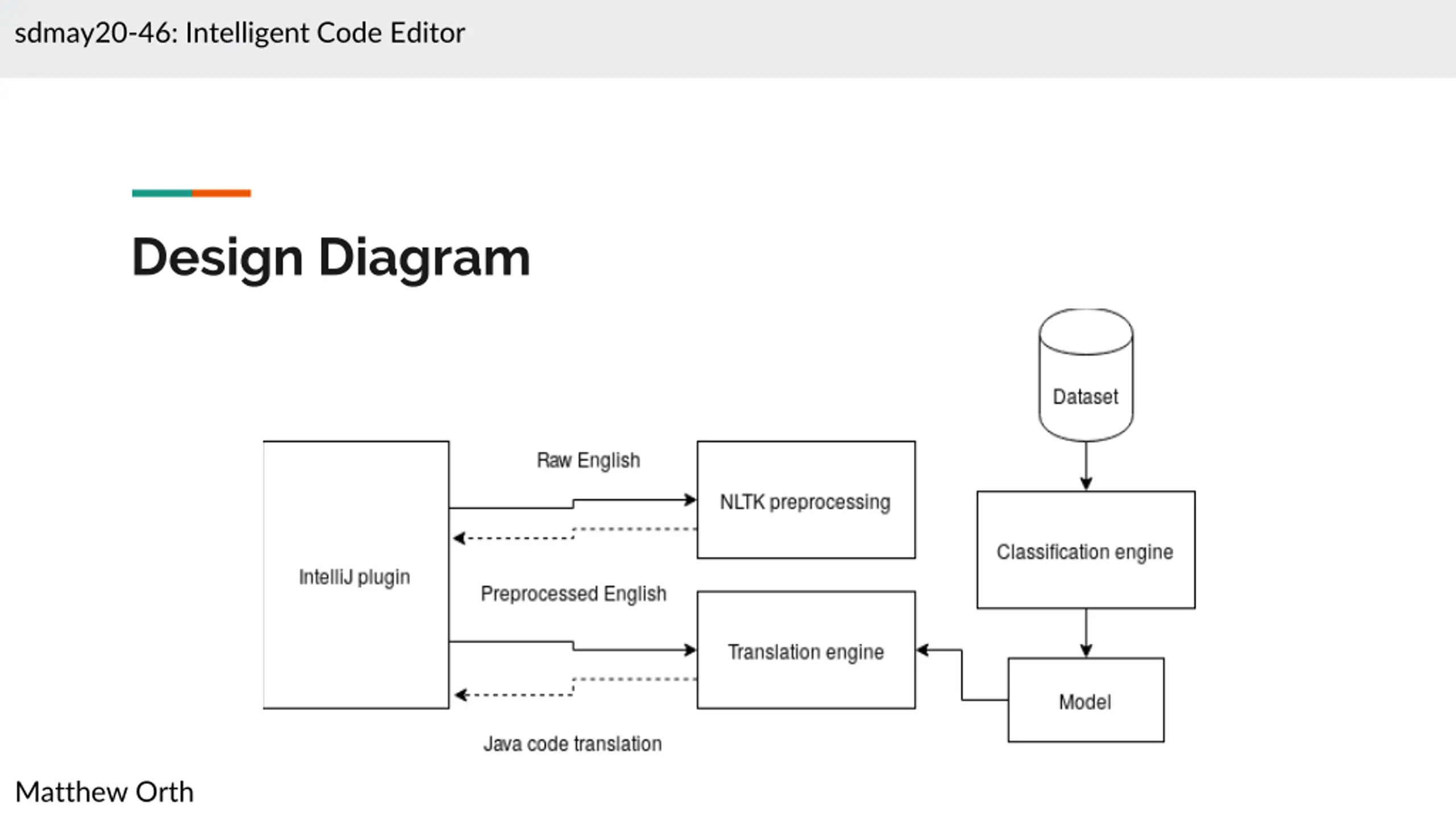 sdmay20-46: Intelligent Code Editor Project Overview Create system that takes natural language input from user and converts to Java code Key contributions User interface (IntelliJ plugin) Natural language and Java code preprocessing Automatic dataset mining method Dataset Classification/translation model (OpenNMT-py) Garet Phelps