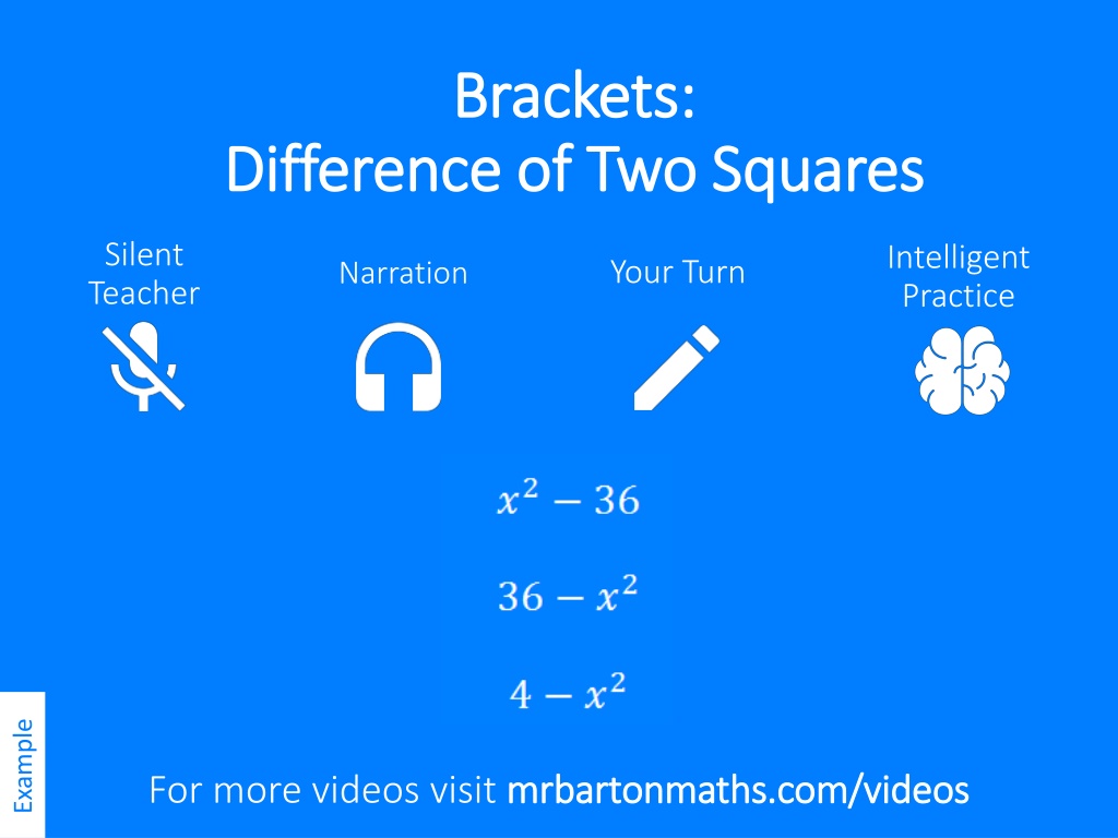 Brackets: Brackets: Difference of Two Squares Difference of Two Squares Silent Teacher Intelligent Practice Your Turn Narration Example For more videos visit mrbartonmaths.com/videos mrbartonmaths.com/videos