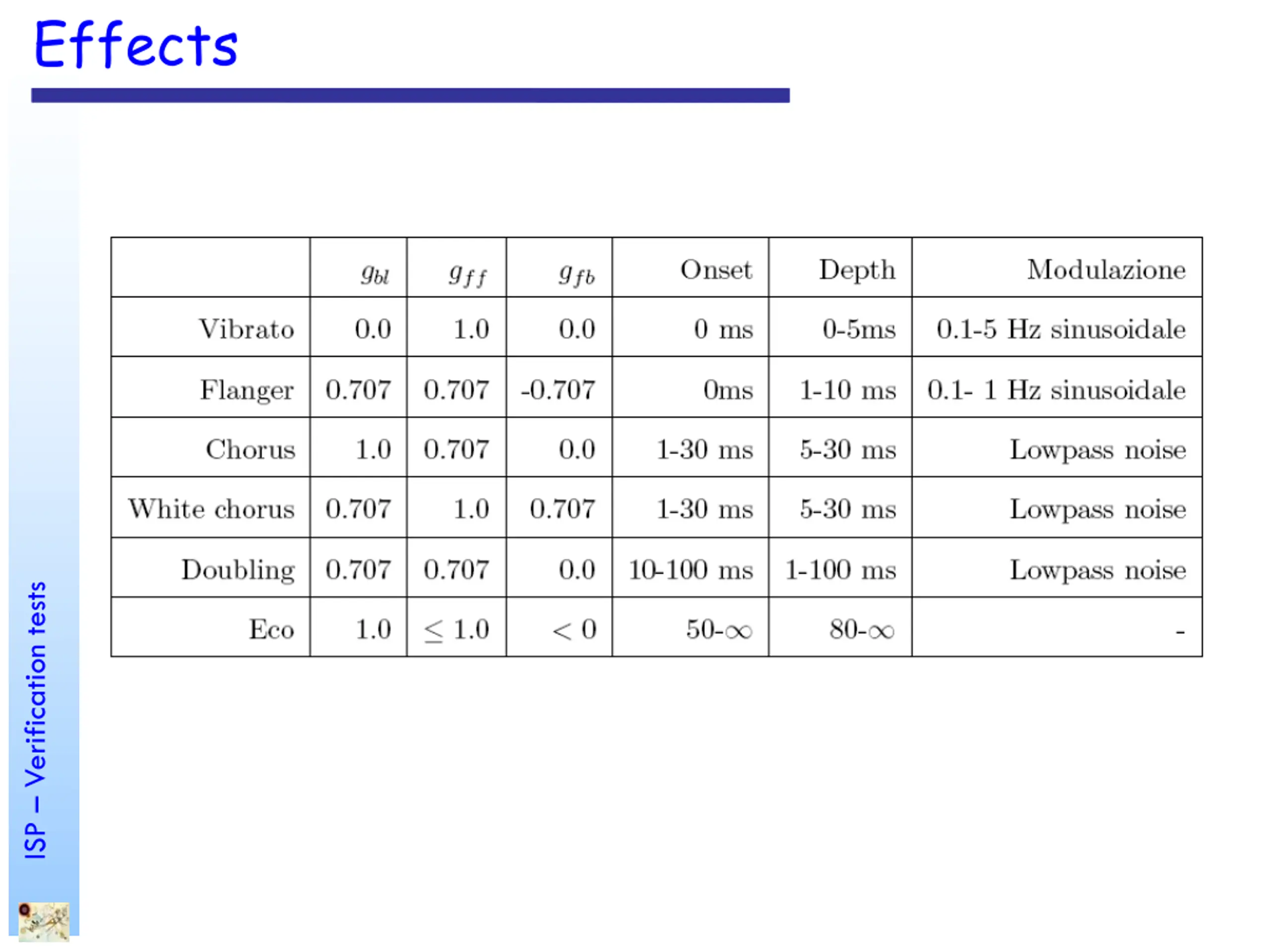 Flanging From the general model eliminating feedback and blending Delay in the range 1 ms 10 ms Equations ISP Verification tests = + [ ] [ ] [ [ ]] y n x n g x n D n ff = + [ ] sin( 2 ) D n D D f n 0 1 FL