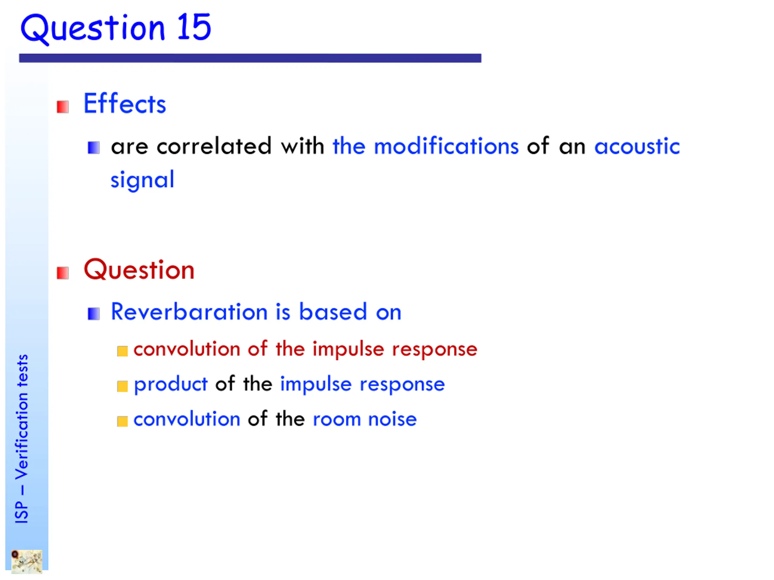 Question 15 Effects are correlated with the modifications of an acoustic signal Question Reverbaration is based on convolution of the impulse response product of the impulse response convolution of the room noise ISP Verification tests