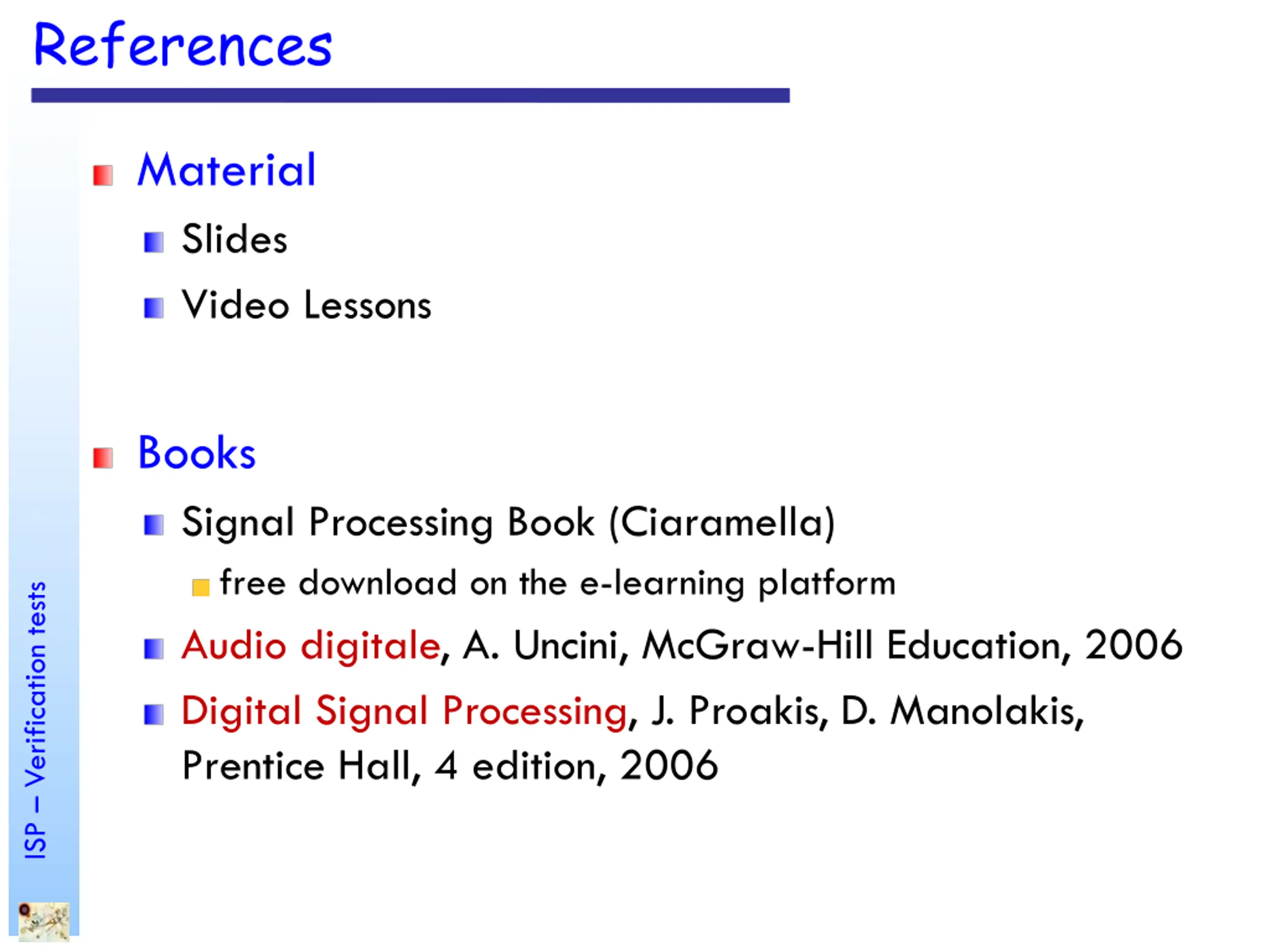 References Material Slides Video Lessons Books Signal Processing Book (Ciaramella) free download on the e-learning platform Audio digitale, A. Uncini, McGraw-Hill Education, 2006 Digital Signal Processing, J. Proakis, D. Manolakis, Prentice Hall, 4 edition, 2006 ISP Verification tests