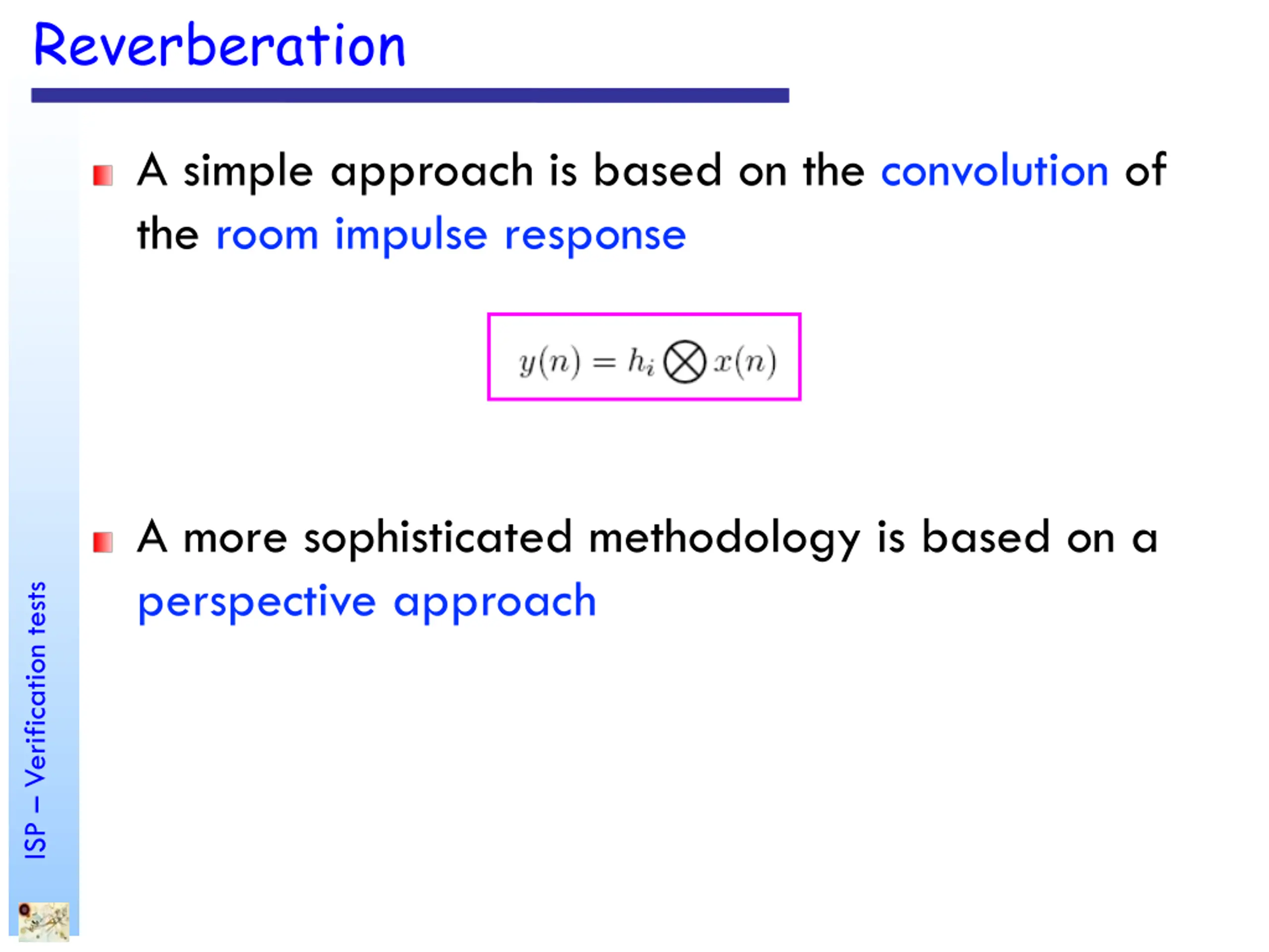 Reverberation A simple approach is based on the convolution of the room impulse response A more sophisticated methodology is based on a perspective approach ISP Verification tests
