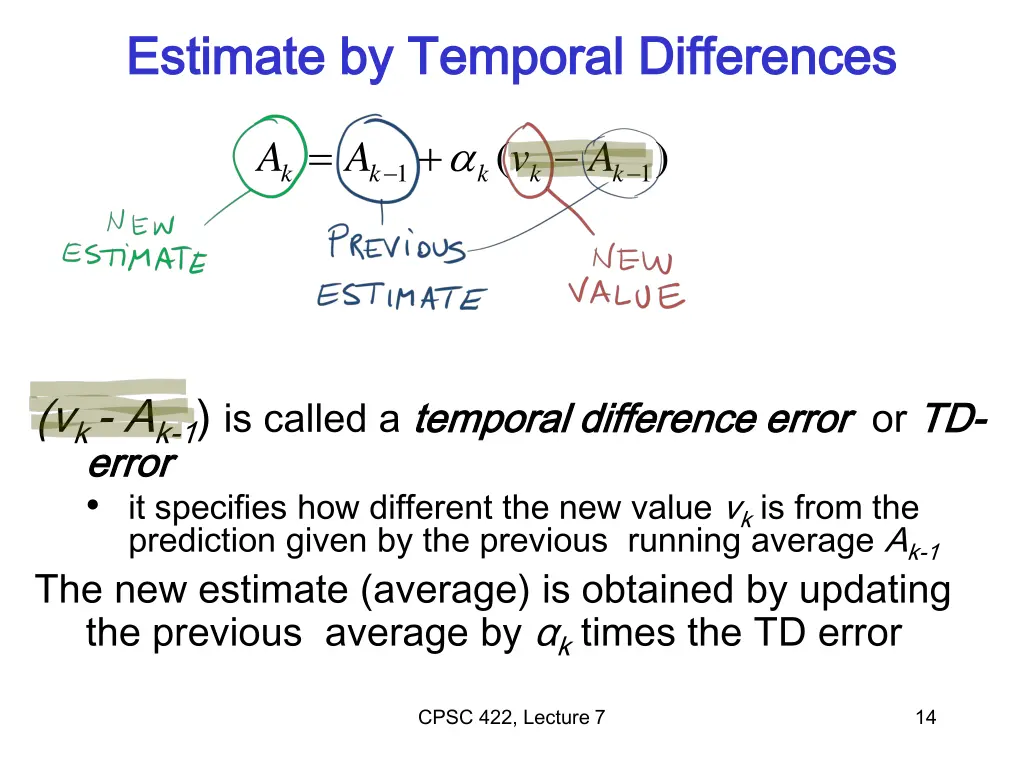 Estimate by Temporal Differences Estimate by Temporal Differences = + ( ) A A v A 1 1 k k k k k (vk - Ak-1) is called a temporal difference error error error it specifies how different the new value vk is from the prediction given by the previous running average Ak-1 The new estimate (average) is obtained by updating the previous average by k times the TD error temporal difference error or TD TD- - CPSC 422, Lecture 7 14