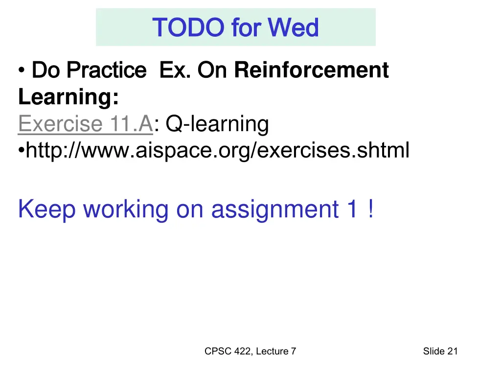 TODO for Wed TODO for Wed Do Practice Ex. On Do Practice Ex. On Reinforcement Learning: Exercise 11.A: Q-learning http://www.aispace.org/exercises.shtml Keep working on assignment 1 ! CPSC 422, Lecture 7 Slide 21