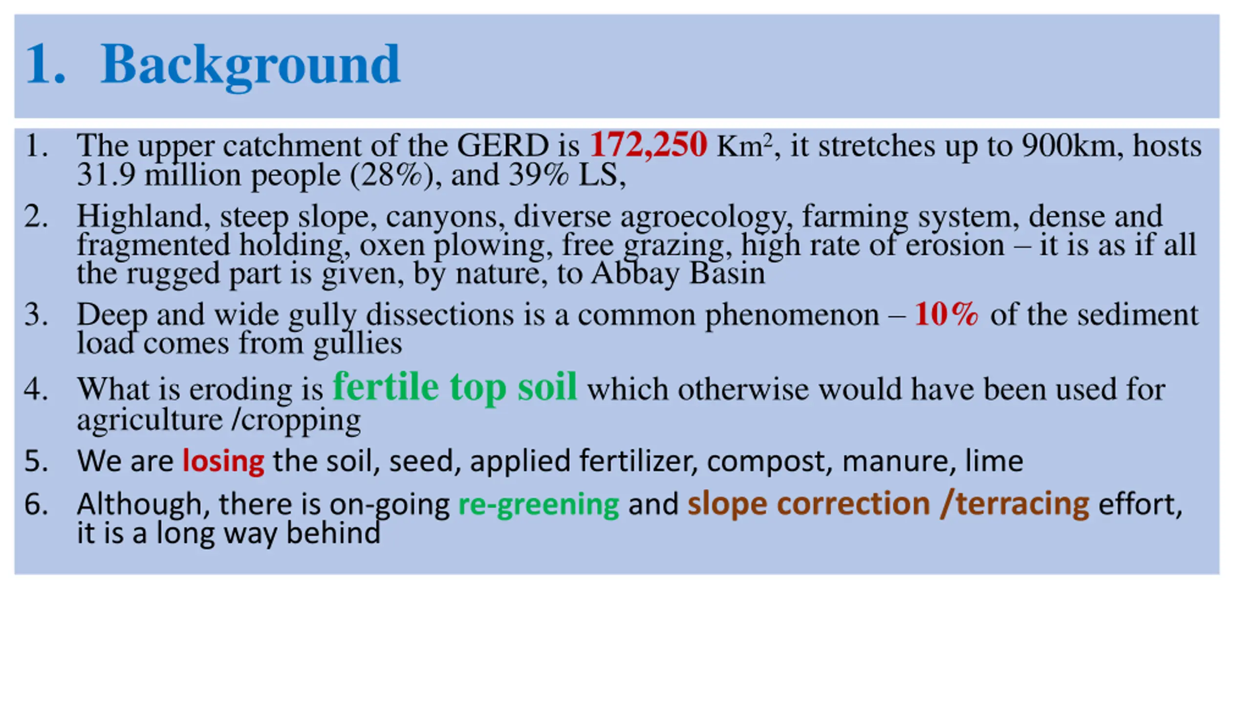 1. Background 1. The upper catchment of the GERD is 172,250Km2, it stretches up to 900km, hosts 31.9 million people (28%), and 39% LS, 2. Highland, steep slope, canyons, diverse agroecology, farming system, dense and fragmented holding, oxen plowing, free grazing, high rate of erosion it is as if all the rugged part is given, by nature, to Abbay Basin 3. Deep and wide gully dissections is a common phenomenon 10% of the sediment load comes from gullies 4. What is eroding is fertile top soil which otherwise would have been used for agriculture /cropping 5. We are losing the soil, seed, applied fertilizer, compost, manure, lime 6. Although, there is on-going re-greening and slope correction /terracing effort, it is a long way behind