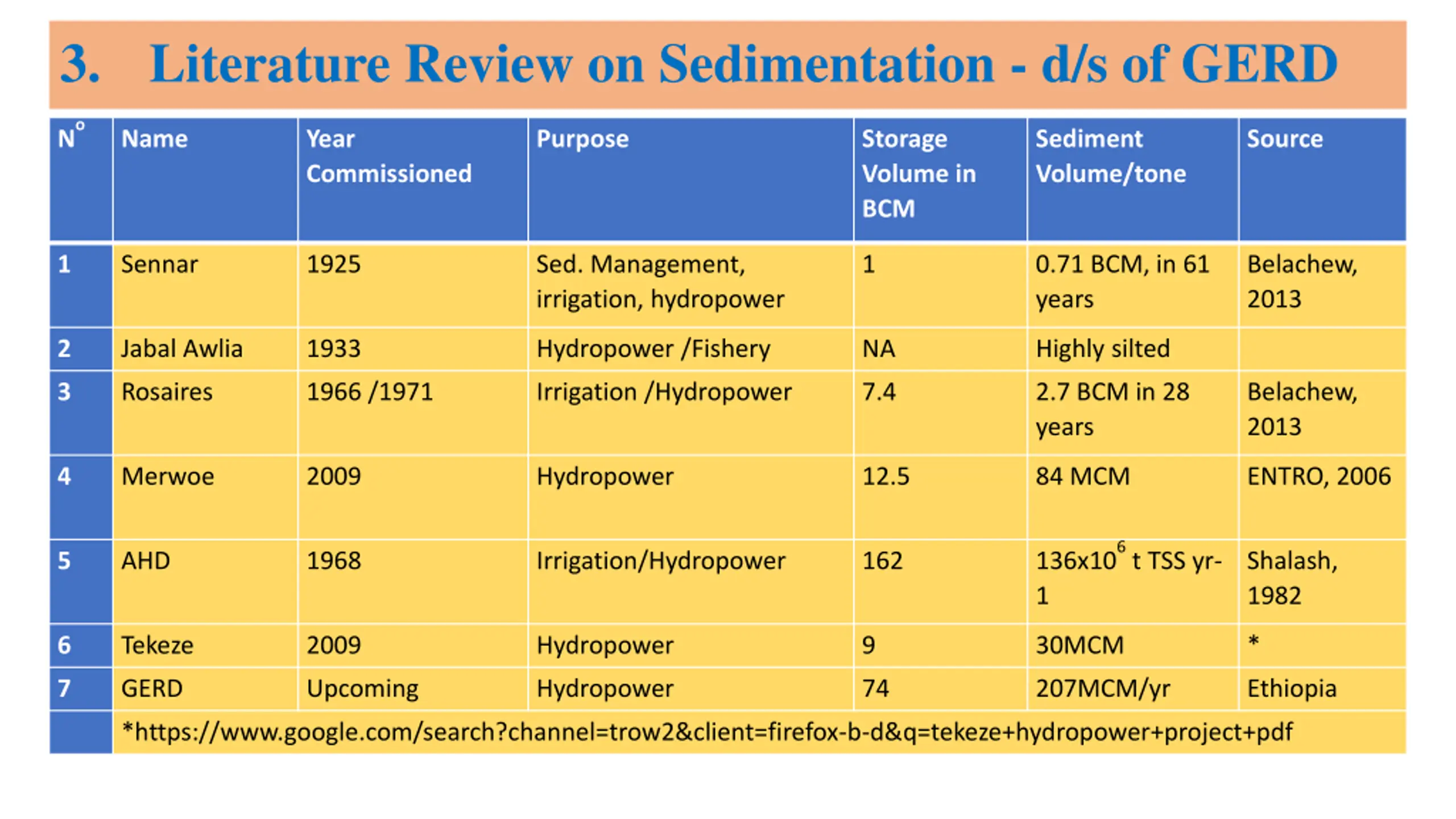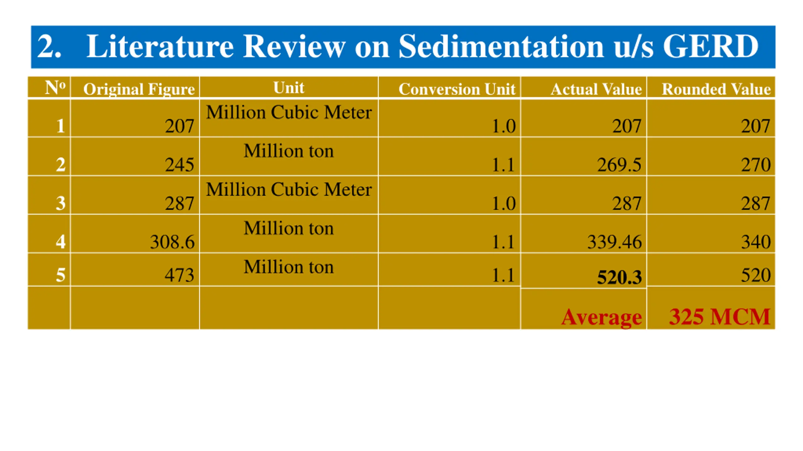 2. Literature Review on Sedimentation u/s GERD No Unit Original Figure Conversion Unit Actual Value Rounded Value 207Million Cubic Meter Million ton 1 1.0 207 207 2 245 287Million Cubic Meter Million ton 1.1 269.5 270 3 1.0 287 287 4 5 308.6 1.1 339.46 340 Million ton 473 1.1 520 520.3 Average 325 MCM