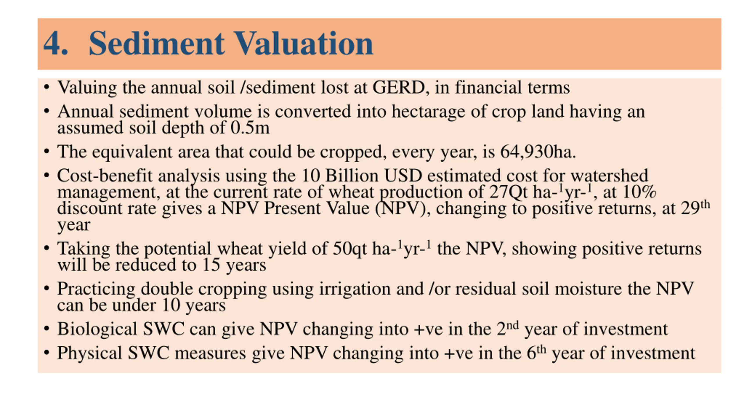 4. Sediment Valuation Valuing the annual soil /sediment lost at GERD, in financial terms Annual sediment volume is converted into hectarage of crop land having an assumed soil depth of 0.5m The equivalent area that could be cropped, every year, is 64,930ha. Cost-benefit analysis using the 10 Billion USD estimated cost for watershed management, at the current rate of wheat production of 27Qt ha-1yr-1, at 10% discount rate gives a NPV Present Value (NPV), changing to positive returns, at 29th year Taking the potential wheat yield of 50qt ha-1yr-1 the NPV, showing positive returns will be reduced to 15 years Practicing double cropping using irrigation and /or residual soil moisture the NPV can be under 10 years Biological SWC can give NPV changing into +ve in the 2nd year of investment Physical SWC measures give NPV changing into +ve in the 6th year of investment