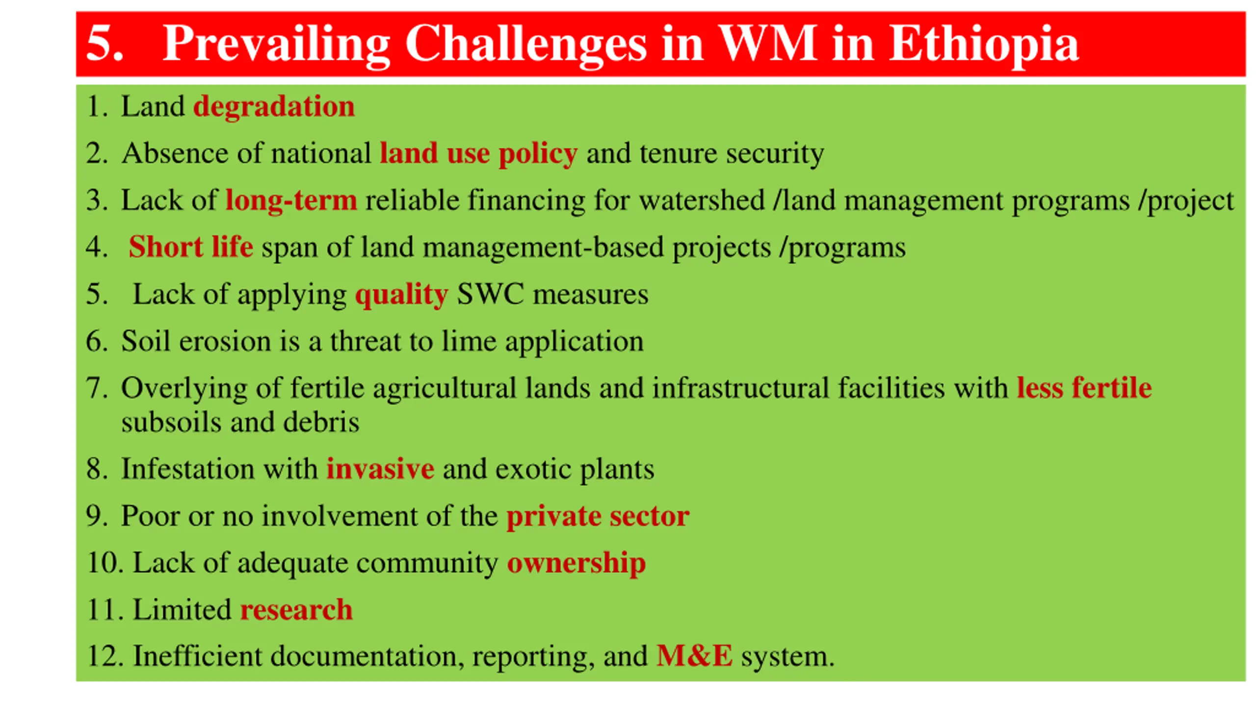 5. Prevailing Challenges in WM in Ethiopia 1. Land degradation 2. Absence of national land use policy and tenure security 3. Lack of long-term reliable financing for watershed /land management programs /project 4. Short life span of land management-based projects /programs 5. Lack of applying quality SWC measures 6. Soil erosion is a threat to lime application 7. Overlying of fertile agricultural lands and infrastructural facilities with less fertile subsoils and debris 8. Infestation with invasive and exotic plants 9. Poor or no involvement of the private sector 10. Lack of adequate community ownership 11. Limited research 12. Inefficient documentation, reporting, and M&E system.