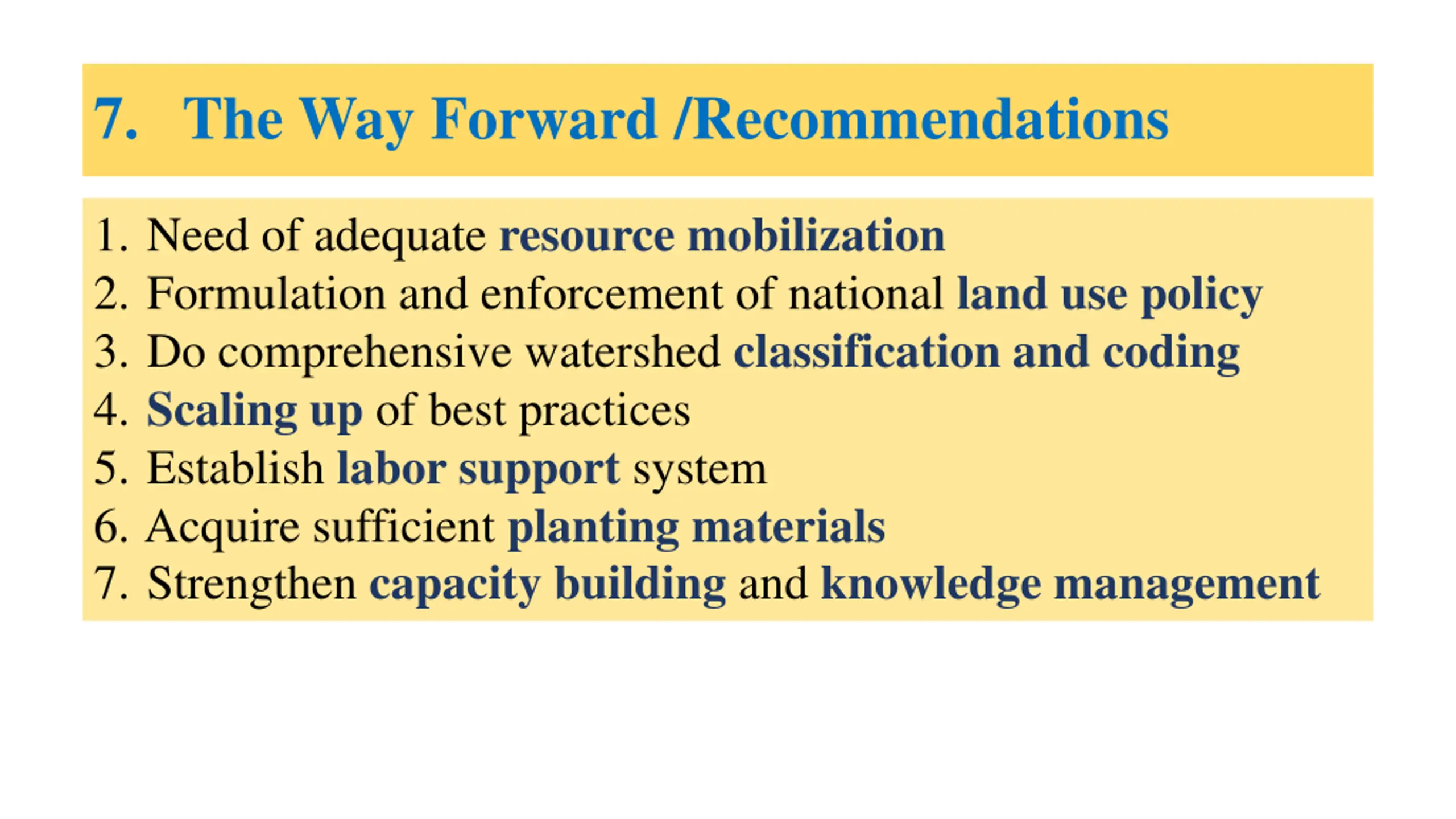 7. The Way Forward /Recommendations 1. Need of adequate resource mobilization 2. Formulation and enforcement of national land use policy 3. Do comprehensive watershed classification and coding 4. Scaling up of best practices 5. Establish labor support system 6. Acquire sufficient planting materials 7. Strengthen capacity building and knowledge management