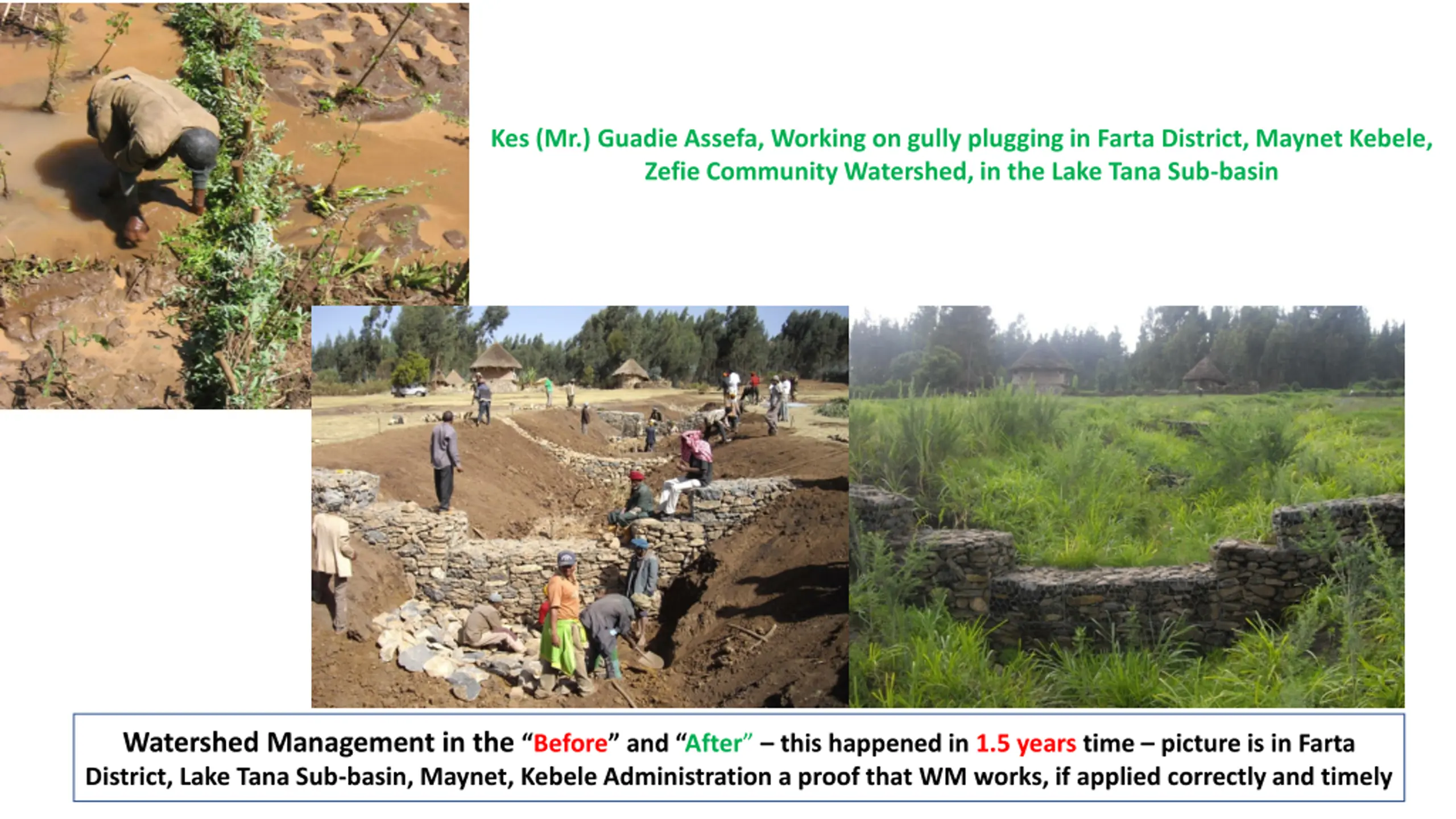 Kes (Mr.) Guadie Assefa, Working on gully plugging in Farta District, Maynet Kebele, Zefie Community Watershed, in the Lake Tana Sub-basin Watershed Management in the Before and After this happened in 1.5 years time picture is in Farta District, Lake Tana Sub-basin, Maynet, Kebele Administration a proof that WM works, if applied correctly and timely