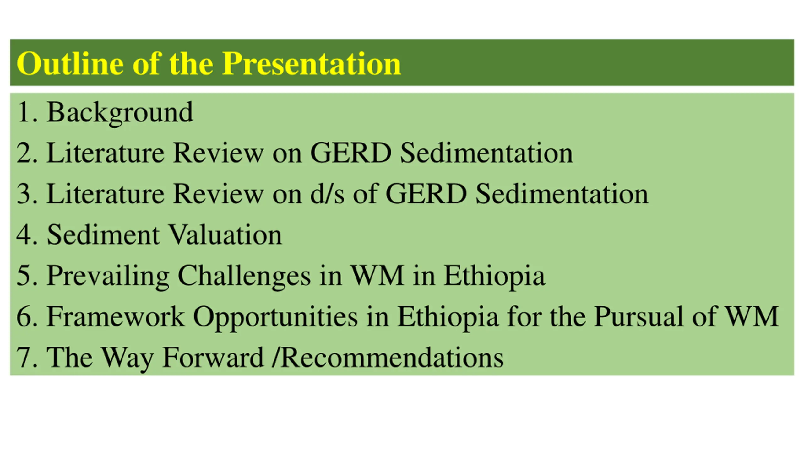 Outline of the Presentation 1. Background 2. Literature Review on GERD Sedimentation 3. Literature Review on d/s of GERD Sedimentation 4. Sediment Valuation 5. Prevailing Challenges in WM in Ethiopia 6. Framework Opportunities in Ethiopia for the Pursual of WM 7. The Way Forward /Recommendations