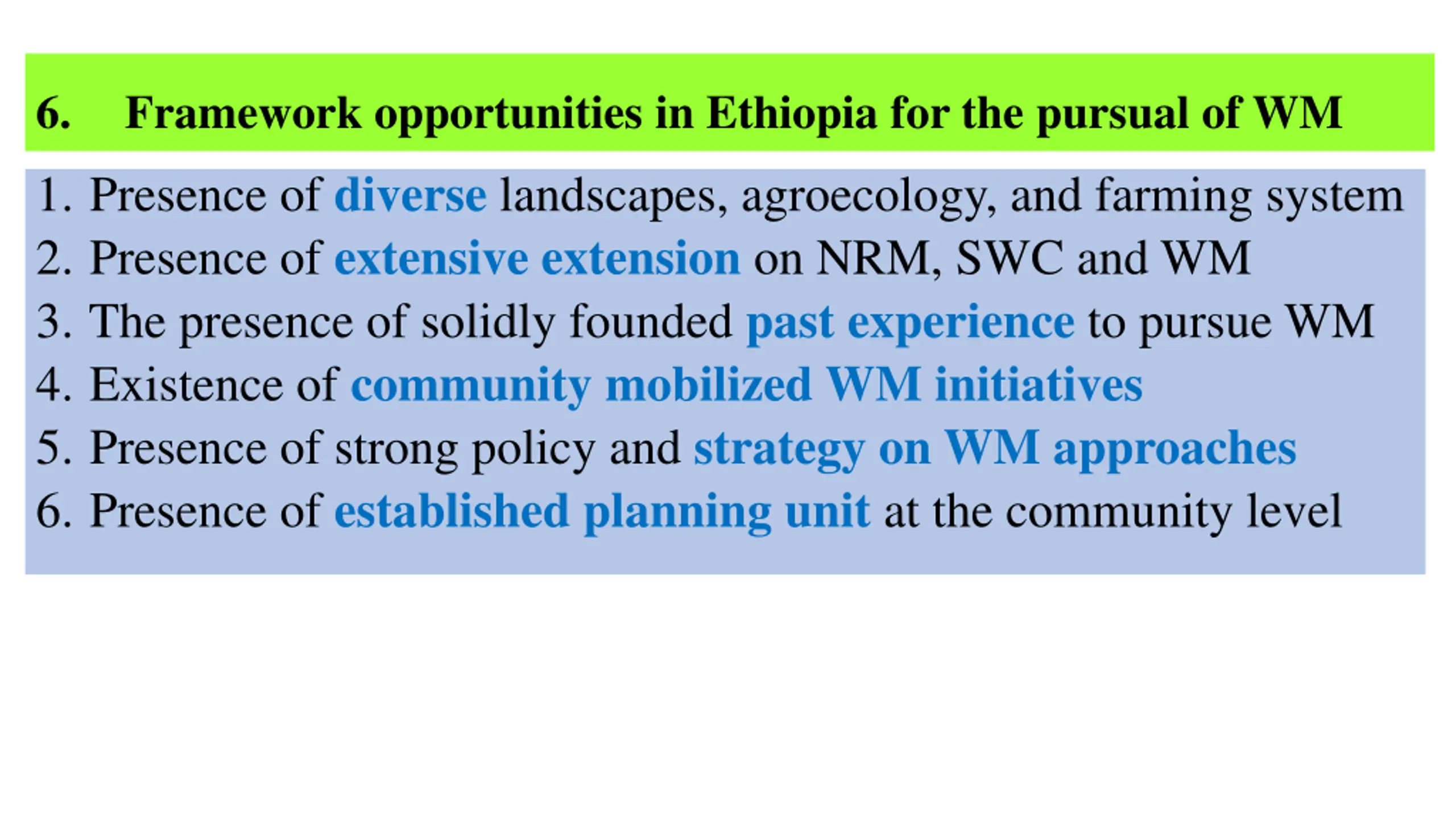 6. Framework opportunities in Ethiopia for the pursual of WM 1. Presence of diverse landscapes, agroecology, and farming system 2. Presence of extensive extension on NRM, SWC and WM 3. The presence of solidly founded past experience to pursue WM 4. Existence of community mobilized WM initiatives 5. Presence of strong policy and strategy on WM approaches 6. Presence of established planning unit at the community level
