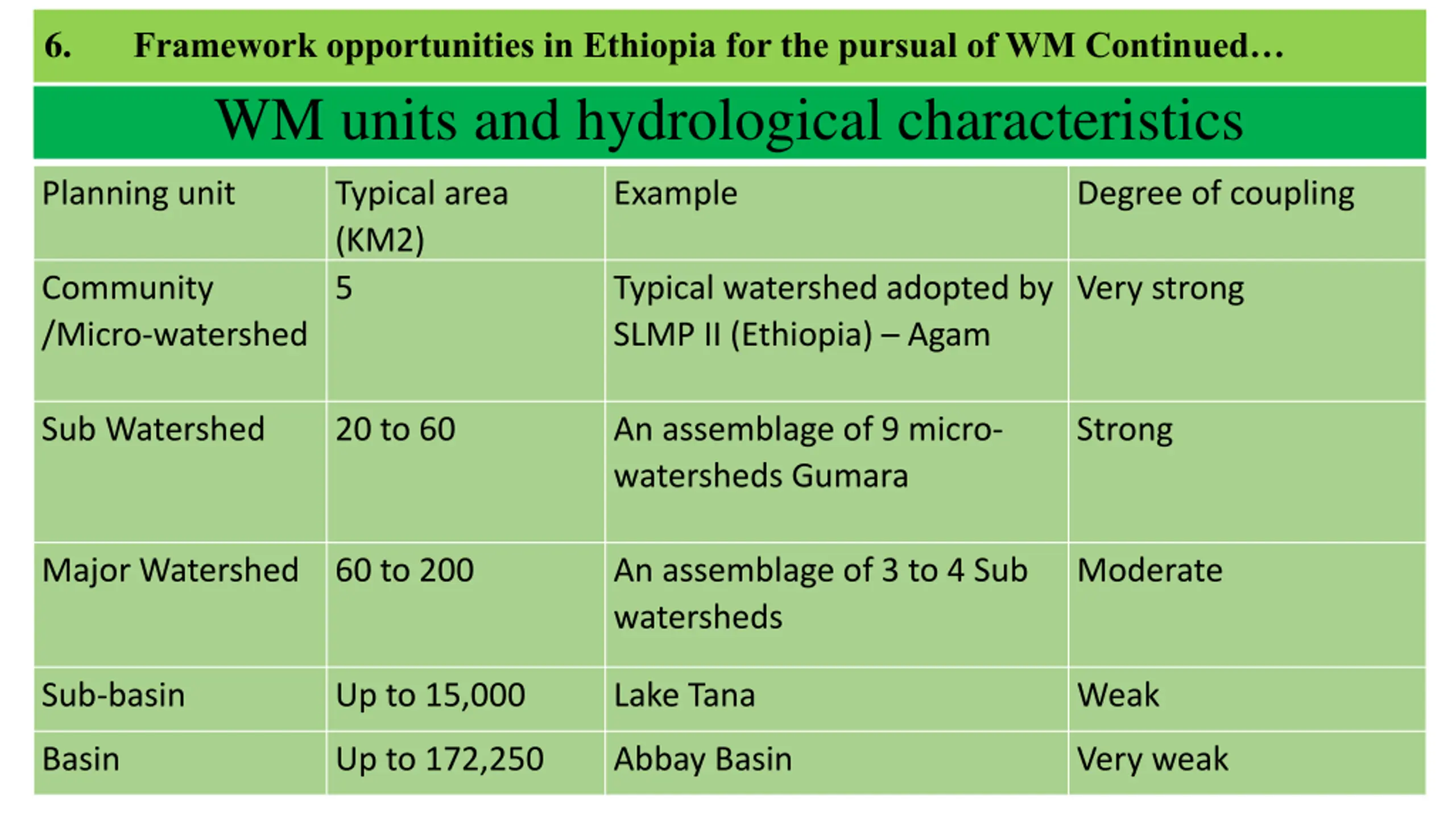 6. Framework opportunities in Ethiopia for the pursual of WM Continued WM units and hydrological characteristics Planning unit Typical area (KM2) 5 Example Degree of coupling Community /Micro-watershed Typical watershed adopted by SLMP II (Ethiopia) Agam Very strong Sub Watershed 20 to 60 An assemblage of 9 micro- watersheds Gumara Strong Major Watershed 60 to 200 An assemblage of 3 to 4 Sub watersheds Moderate Sub-basin Up to 15,000 Lake Tana Weak Basin Up to 172,250 Abbay Basin Very weak