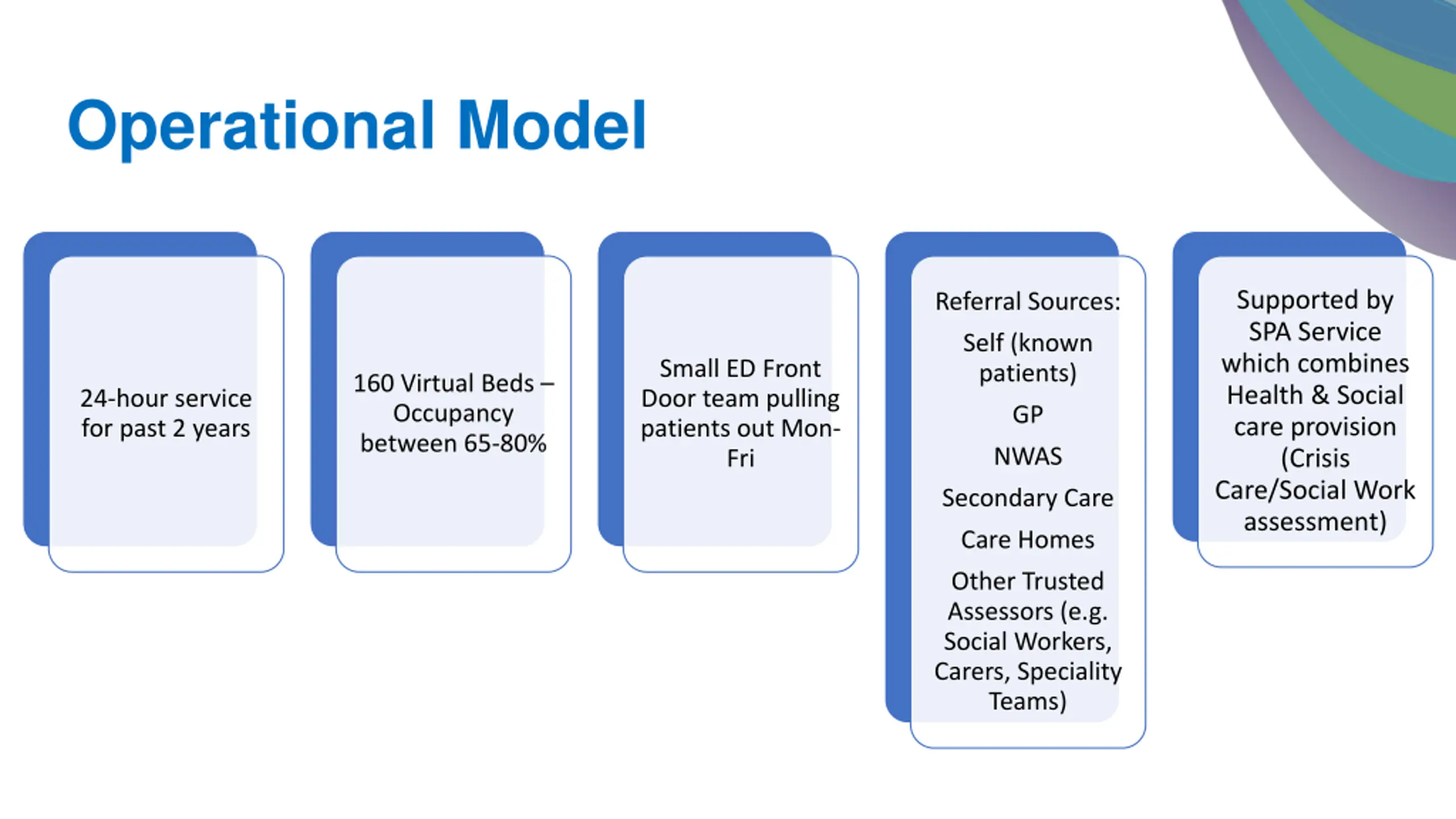 Operational Model Supported by SPA Service which combines Health & Social care provision (Crisis Care/Social Work assessment) Referral Sources: Self (known patients) Small ED Front Door team pulling patients out Mon- Fri 160 Virtual Beds Occupancy between 65-80% 24-hour service for past 2 years GP NWAS Secondary Care Care Homes Other Trusted Assessors (e.g. Social Workers, Carers, Speciality Teams)