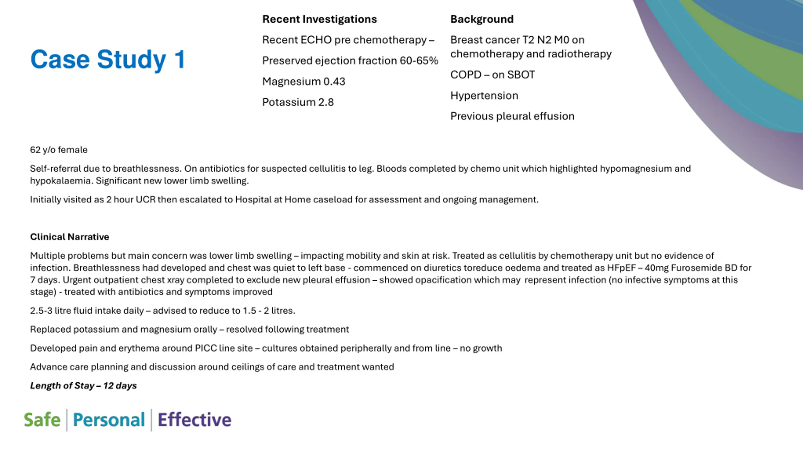 Recent Investigations Background Recent ECHO pre chemotherapy Breast cancer T2 N2 M0 on chemotherapy and radiotherapy Case Study 1 Preserved ejection fraction 60-65% COPD on SBOT Magnesium 0.43 Hypertension Potassium 2.8 Previous pleural effusion 62 y/o female Self-referral due to breathlessness. On antibiotics for suspected cellulitis to leg. Bloods completed by chemo unit which highlighted hypomagnesium and hypokalaemia. Significant new lower limb swelling. Initially visited as 2 hour UCR then escalated to Hospital at Home caseload for assessment and ongoing management. Clinical Narrative Multiple problems but main concern was lower limb swelling impacting mobility and skin at risk. Treated as cellulitis by chemotherapy unit but no evidence of infection. Breathlessness had developed and chest was quiet to left base - commenced on diuretics toreduce oedema and treated as HFpEF 40mg Furosemide BD for 7 days. Urgent outpatient chest xray completed to exclude new pleural effusion showed opacification which may represent infection (no infective symptoms at this stage) - treated with antibiotics and symptoms improved 2.5-3 litre fluid intake daily advised to reduce to 1.5 - 2 litres. Replaced potassium and magnesium orally resolved following treatment Developed pain and erythema around PICC line site cultures obtained peripherally and from line no growth Advance care planning and discussion around ceilings of care and treatment wanted Length of Stay 12 days