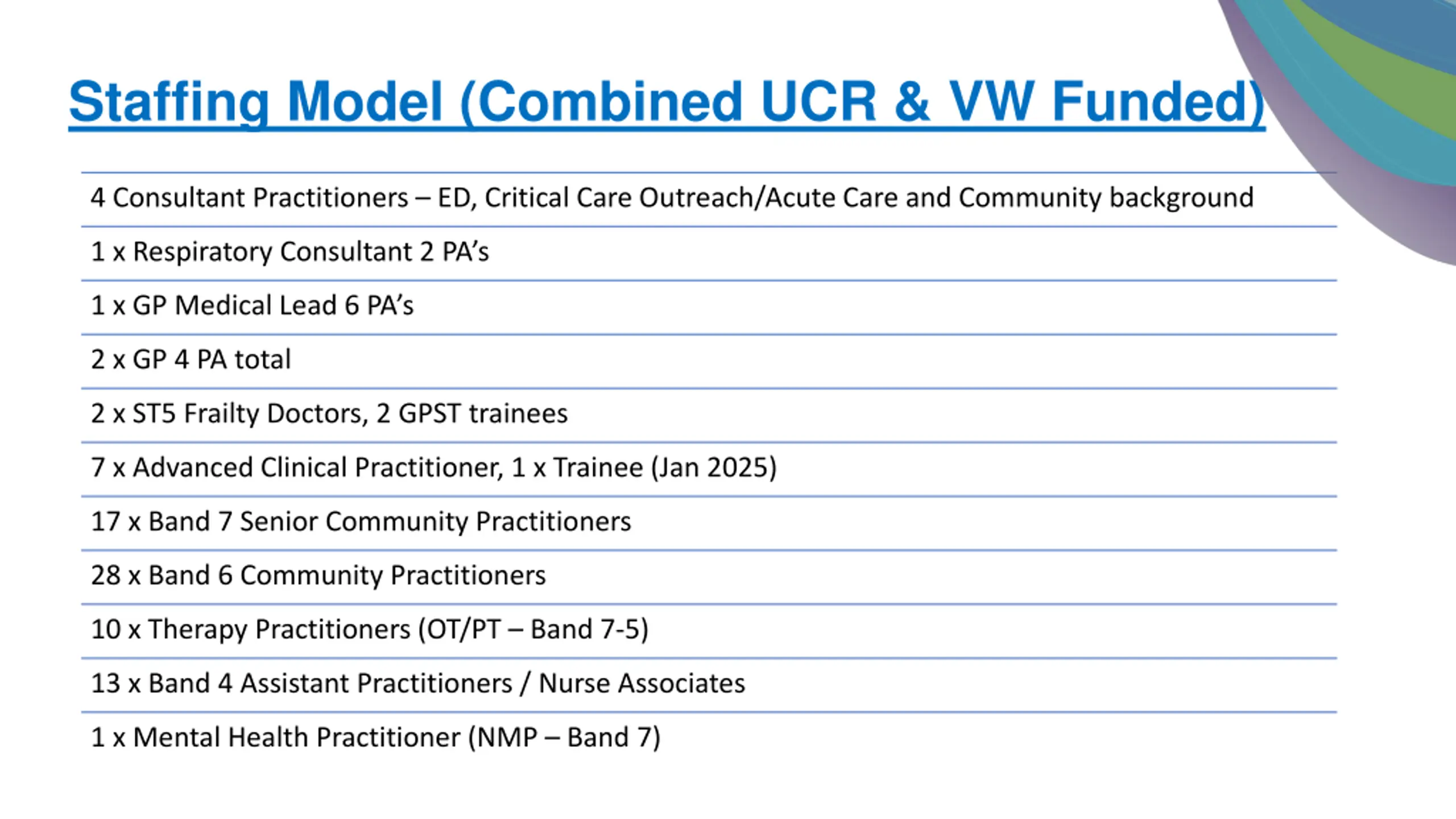Staffing Model (Combined UCR & VW Funded) 4 Consultant Practitioners ED, Critical Care Outreach/Acute Care and Community background 1 x Respiratory Consultant 2 PA s 1 x GP Medical Lead 6 PA s 2 x GP 4 PA total 2 x ST5 Frailty Doctors, 2 GPST trainees 7 x Advanced Clinical Practitioner, 1 x Trainee (Jan 2025) 17 x Band 7 Senior Community Practitioners 28 x Band 6 Community Practitioners 10 x Therapy Practitioners (OT/PT Band 7-5) 13 x Band 4 Assistant Practitioners / Nurse Associates 1 x Mental Health Practitioner (NMP Band 7)