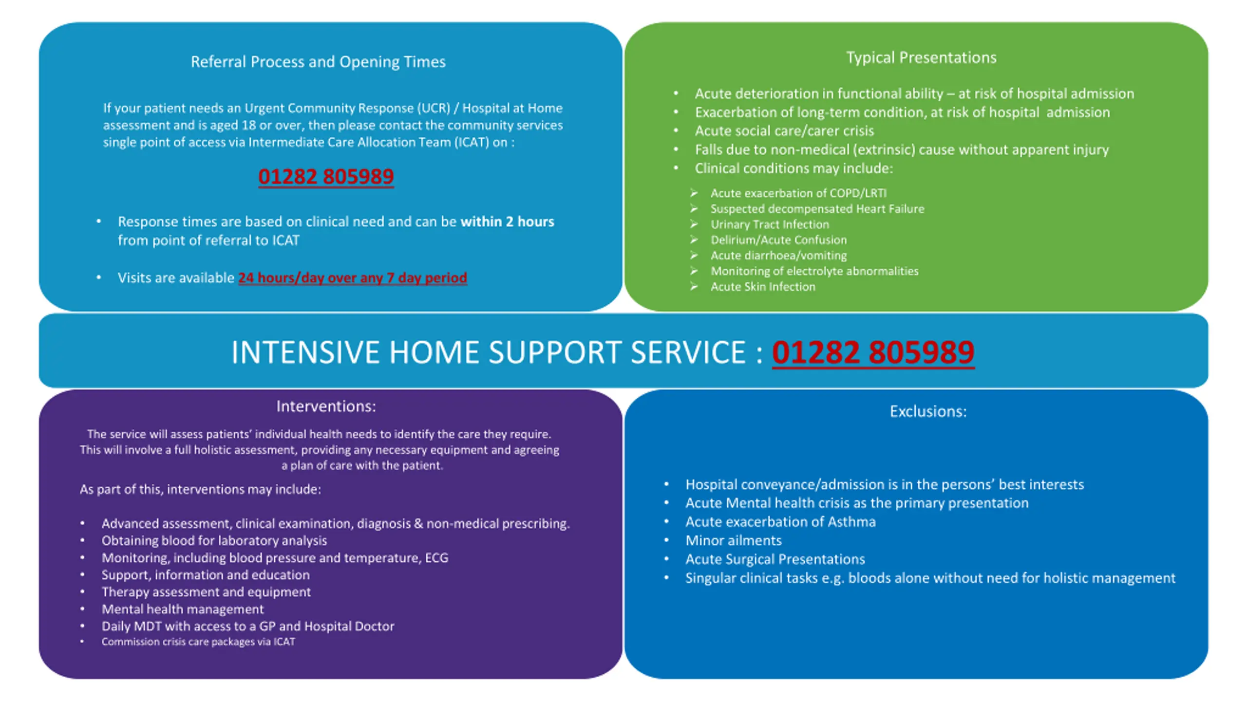 Typical Presentations Referral Process and Opening Times Acute deterioration in functional ability at risk of hospital admission Exacerbation of long-term condition, at risk of hospital admission Acute social care/carer crisis Falls due to non-medical (extrinsic) cause without apparent injury Clinical conditions may include: If your patient needs an Urgent Community Response (UCR) / Hospital at Home assessment and is aged 18 or over, then please contact the community services single point of access via Intermediate Care Allocation Team (ICAT) on : 01282 805989 Acute exacerbation of COPD/LRTI Suspected decompensated Heart Failure Urinary Tract Infection Delirium/Acute Confusion Acute diarrhoea/vomiting Monitoring of electrolyte abnormalities Acute Skin Infection Response times are based on clinical need and can be within 2 hours from point of referral to ICAT Visits are available 24 hours/day over any 7 day period INTENSIVE HOME SUPPORT SERVICE : 01282 805989 Interventions: Exclusions: The service will assess patients individual health needs to identify the care they require. This will involve a full holistic assessment, providing any necessary equipment and agreeing a plan of care with the patient. Hospital conveyance/admission is in the persons best interests Acute Mental health crisis as the primary presentation Acute exacerbation of Asthma Minor ailments Acute Surgical Presentations Singular clinical tasks e.g. bloods alone without need for holistic management As part of this, interventions may include: Advanced assessment, clinical examination, diagnosis & non-medical prescribing. Obtaining blood for laboratory analysis Monitoring, including blood pressure and temperature, ECG Support, information and education Therapy assessment and equipment Mental health management Daily MDT with access to a GP and Hospital Doctor Commission crisis care packages via ICAT