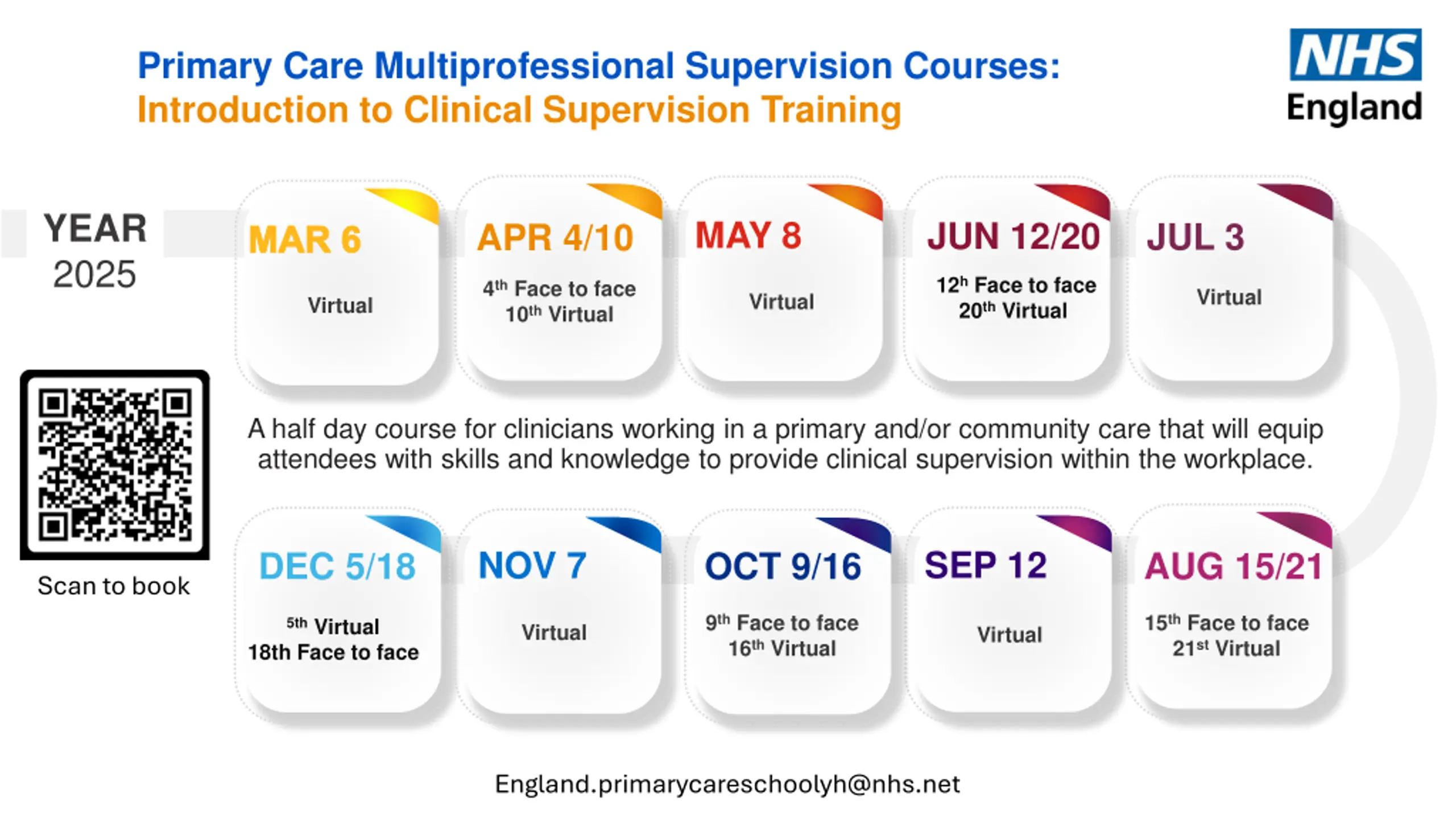 Primary Care Multiprofessional Supervision Courses: Supervisor Community of Practice Lunch and Learn sessions YEAR 2025 MAY 15/30 JUN 6/12 JUL 10/25 APR 11/24 Accountabilities and responsibilities in supervision MAR 13/28 Reflective Practice in Supervision Understanding learning theories and styles Maintaining competence as a supervisor Creating a safe environment for supervision A forum for all clinicians to maintain educator and supervisor knowledge, skills and behaviours on a regular basis. Virtual 30-minute lunchtime sessions. SEP 5/18 Delivering individualised support for supervisees NOV 6/20 OCT 2/10 AUG 8/14 DEC 12/18 Overcoming barriers to effective supervision Scan to book Types of Clinical Supervision Supporting supervisees in difficulty Benefits of supervision England.primarycareschoolyh@nhs.net