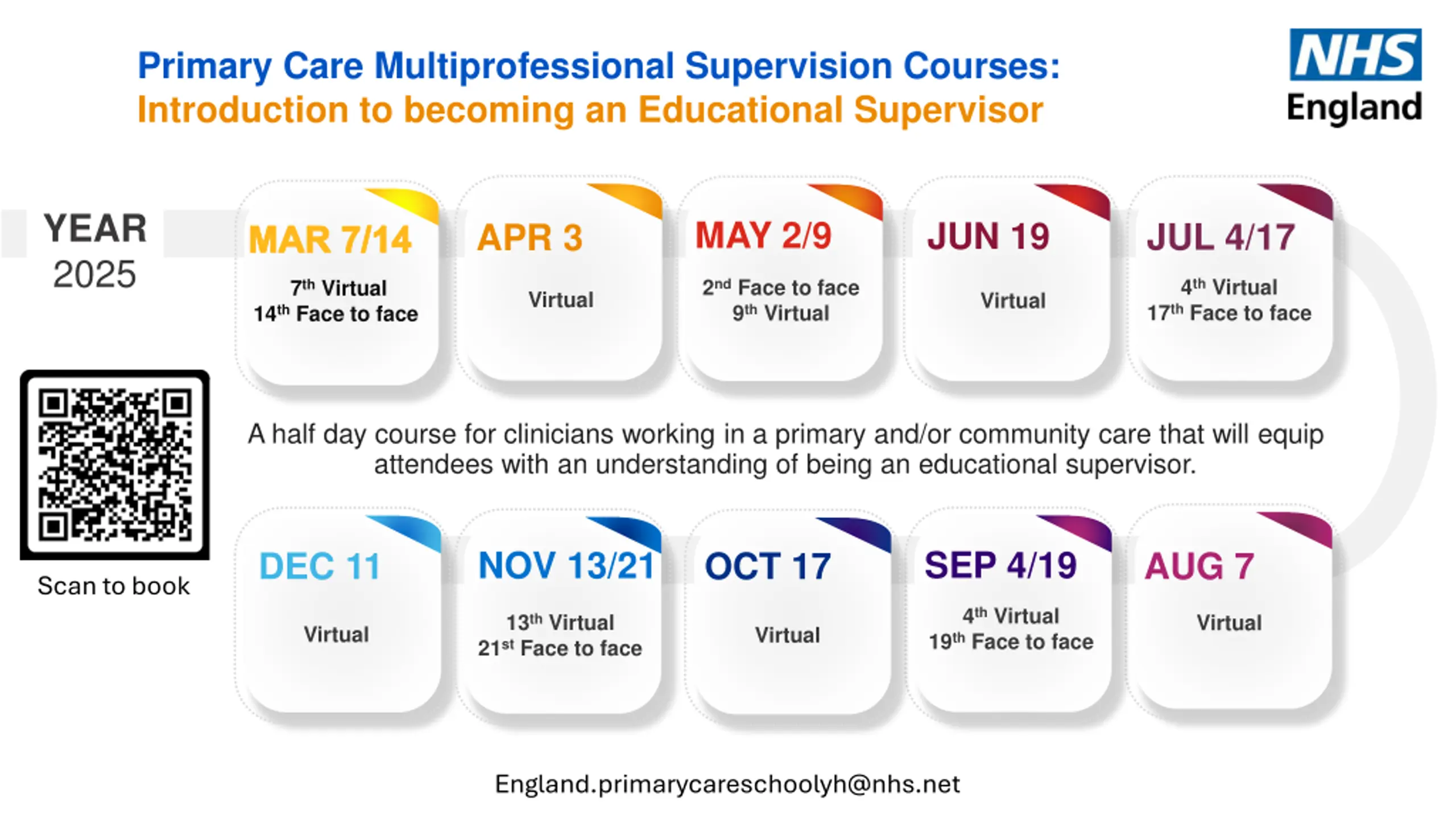 Primary Care Multiprofessional Supervision Courses: Intending GP trainers and Multiprofessional Supervisor Pathway YEAR 2025 MAY 22/29 JUN 19/26 JUL 17/24 APR 17/24 MAR 20/27 Day 1 17 Day 2 24 Day 1 17 Day 2 24 Day 1 22 Day 2 29 Day 1 20 Day 2 27 Day 1 19 Day 2 26 1.5 / 2-day virtual multi-professional course providing the knowledge and skills required to be an effective educational supervisor. Aimed at all clinicians working in primary and community care. SEP 18/25 NOV 20/27 OCT 23/30 AUG 21/28 DEC 4/11 Scan to book Day 1 04 Day 2 11 Day 1 23 Day 2 30 Day 1 18 Day 2 25 Day 1 21 Day 2 28 Day 1 20 Day 2 27 England.primarycareschoolyh@nhs.net