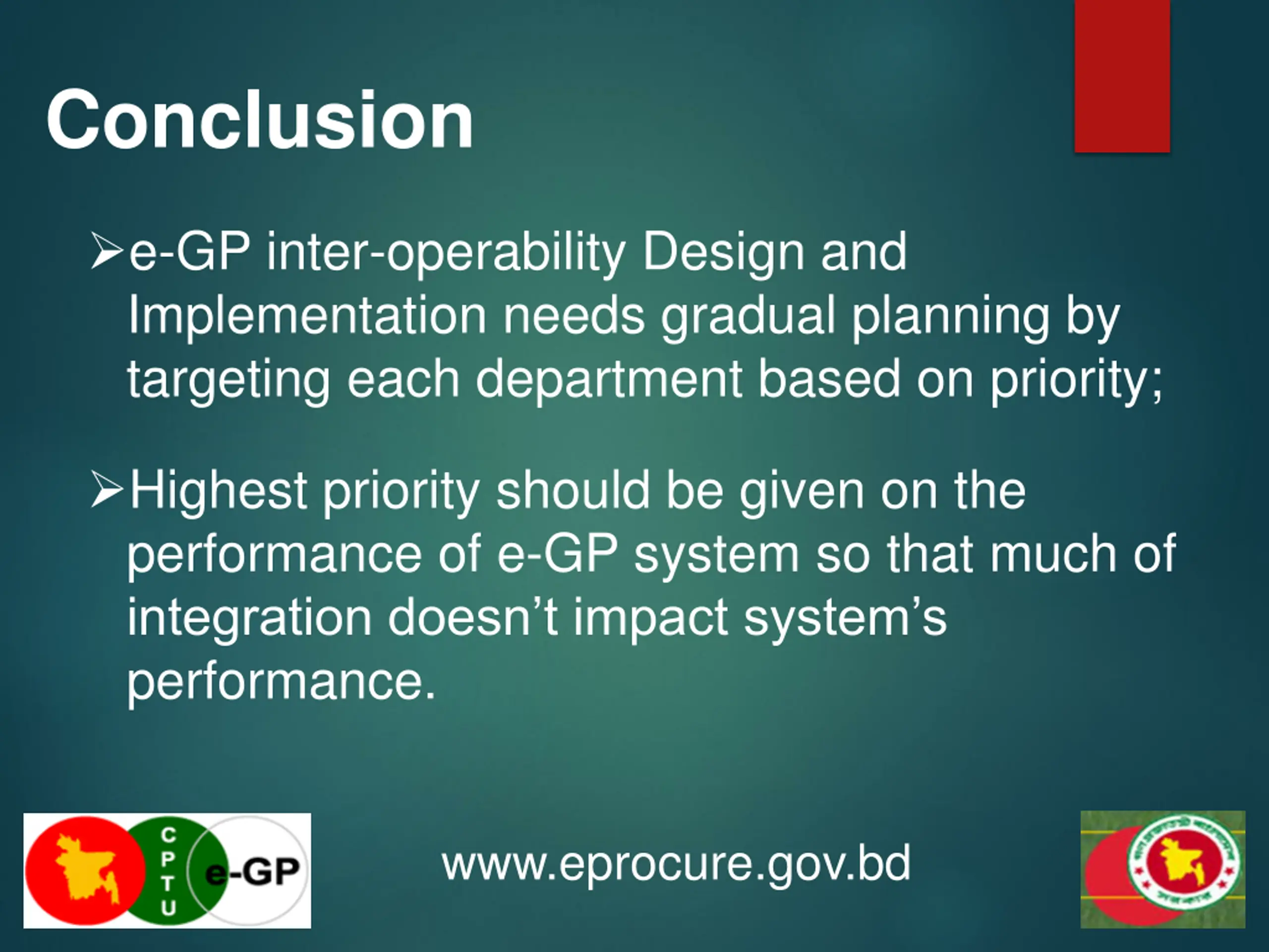 Conclusion e-GP inter-operability Design and Implementation needs gradual planning by targeting each department based on priority; Highest priority should be given on the performance of e-GP system so that much of integration doesn t impact system s performance. www.eprocure.gov.bd