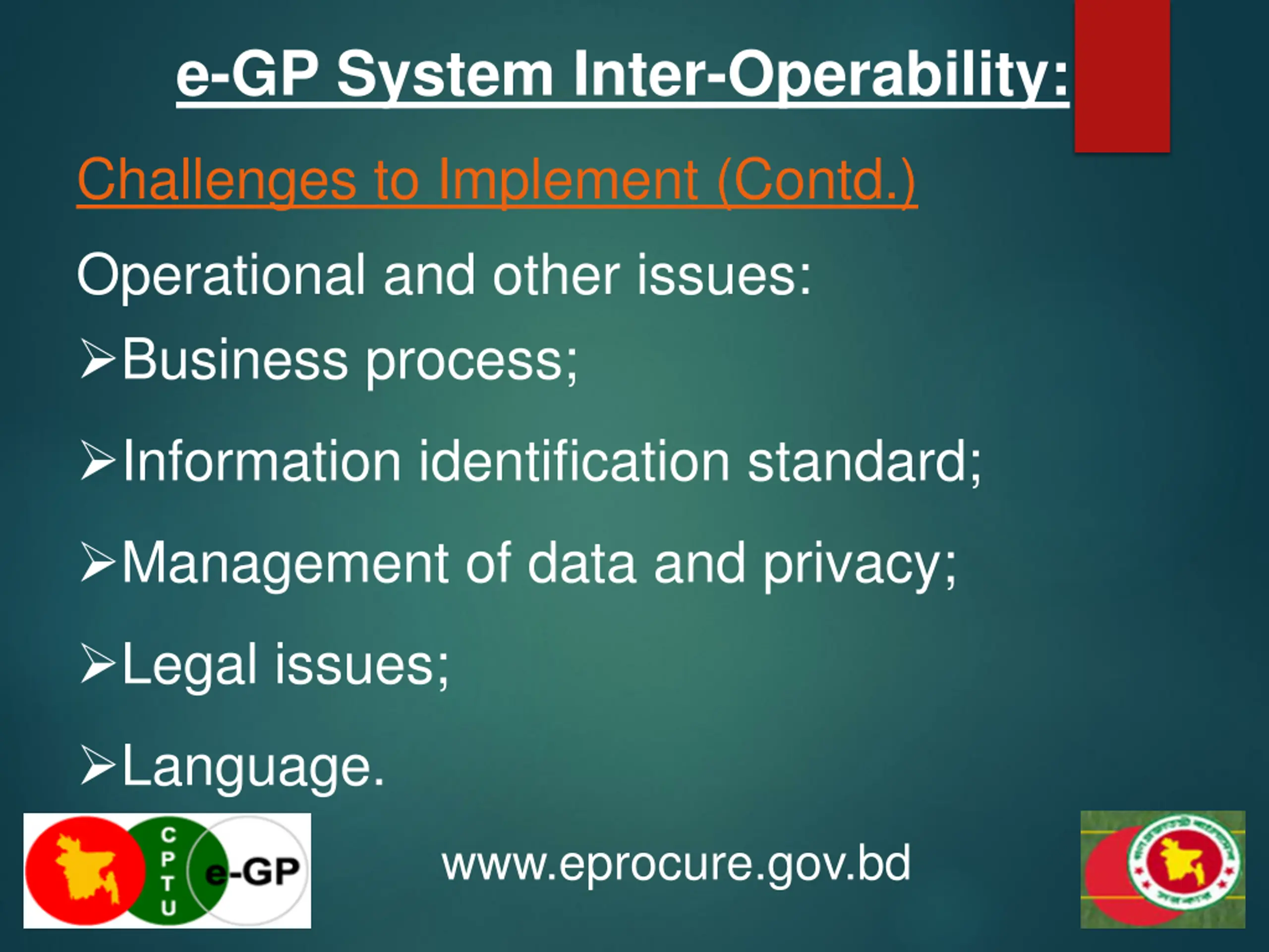 e-GP System Inter-Operability: Challenges to Implement (Contd.) Operational and other issues: Business process; Information identification standard; Management of data and privacy; Legal issues; Language. www.eprocure.gov.bd