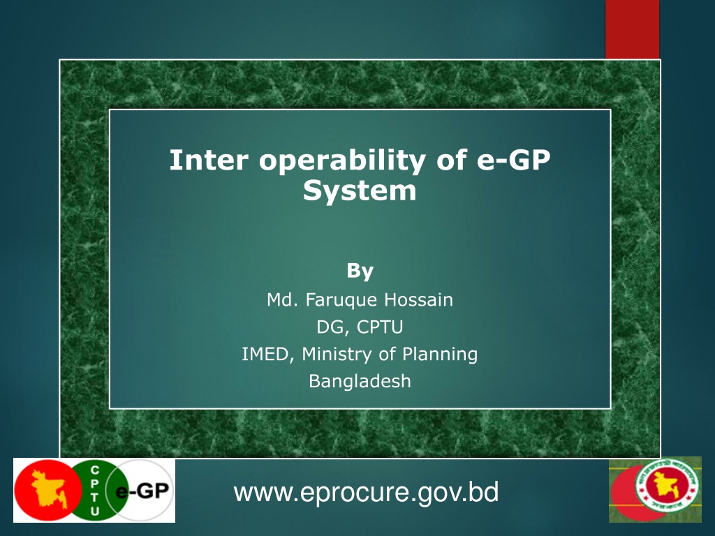 Inter operability of e-GP System By Md. Faruque Hossain DG, CPTU IMED, Ministry of Planning Bangladesh www.eprocure.gov.bd